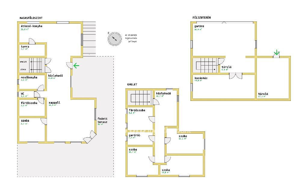 A magasföldszinten világos nappali, étkezőkonyha, háztartási helyiség, háló és fedett terasz szolgálja a család mindennapjait. Az emelet 3 hálószobát, gardróbot és egy kényelmes fürdőszobát kínál, így mindenki megtalálja a saját kuckóját. A félszuterénben garázs, kazánház és tárolók kaptak helyet, ideális akár hobbiknak, akár praktikus családi használatra, de a terasz alatti tároló külön bejáratú, így itt akár irodát, vagy szalont is kialakíthat.