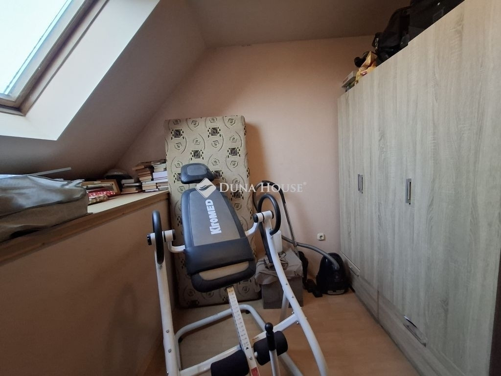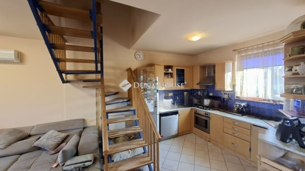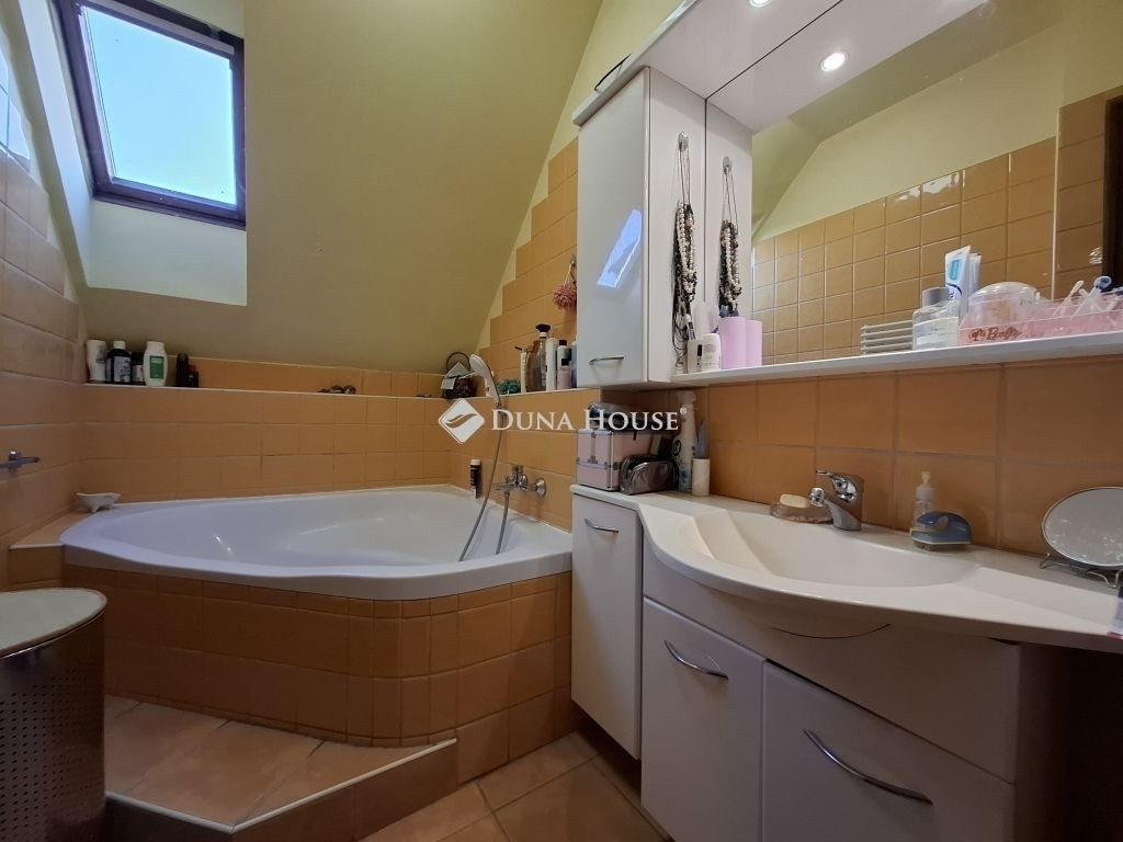 Az épület egy csendes, aszfaltos utcáról, gondozott, zöld felületekkel övezett közterületen keresztül közelíthető meg. Az értékesítésre váró telekrészre az ügyvédi megosztó szerint kimért, kerítéssel elválasztott előkertre nyíló kis- és nagykapunk jutunk be, hogy onnan autóval a ház alatti garázsba vagy néhány lépcsőfok megtételét követően a fedett teraszon át a lakásba juthassunk. A dél-nyugati fekvésű teraszról nyíló bejárati ajtón az előtéren keresztül a lakás lelkét adó tágas nappaliba érkezünk. A család apraja-nagyja a földszinti életteret benépesítheti, mivel a nappali egy légtérben van az étkezővel és a lehelletnyit elválasztott, jól felszerelt konyhával.Az amúgy is világos, az utcai és udvari oldal felőli ablakok általi körbe-napozás miatt egész napon át napfényes 34 m2-es nappali-étkező-konyha élettérből a jó idő kicsábítja az embert a szabadba. Erre lehetőséget nyújt az ugyancsak tágas fedett teraszon elköltött családi ebéd, sütögetés vagy finom kávézás. A konyhai élettér az utcafronti ablakhoz közeli és hidegburkolattal ellátott. A nappali és étkező padlója diszkréten elválasztja egymástól a tágas életteret. A radiátoros fűtésen túl egy hűtő-fűtő klíma szolgálja a kellemes hőérzetet. A földszinten található egy, az előtérből nyíló zuhanyzós fürdőszoba WC-vel. A nappaliból egy faburkolatos lépcsőn keresztül távozhatunk az emeleti szobákba. A tetőtérbeépítéses emeleti életteret egy lépcsőn keresztül, a kerámiaburkolatos közlekedőre jutva közelíthetünk meg, ahol barátságos hangulat fogad minket. Innen nyílik 3 félszoba, a fürdőszoba és egy külön apró helyiség WC-vel. A 7-8 m2-es, tiszta területtel rendelkező napsütötte, világos szobák jó elrendezésüknek és a kényelmes belmagasságnak köszönhetően méretük ellenére tágasnak tűnnek, kényelmesen elfér mindegyikben az intim életérzést keltő berendezés és elegendő teret nyújtanak a pihenésre, tanulásra, elmélyülésre. Minden helyiségben a barna, tömörfa nyílászárók a jellemzőek. Az összes szoba klímaberendezéssel felszerelt.A napsárga csempével burkolt világos, tágas, sarokkádas kialakítású fürdőszobába a tetőablakon át bőséges napfény jut, a lépcsős megközelítésű sarokkád és a kád körüli pakolófelületek budoárérzést nyújtanak, napfürdőre adnak lehetőséget. Az emeleten külön apró helyiségben kapott helyet a WC.