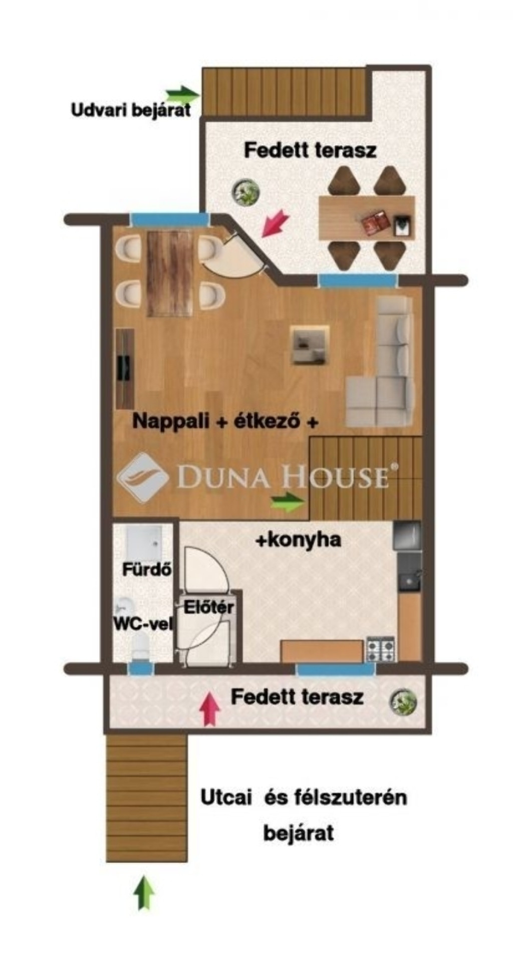 -földszinti udvari félig fedett terasz: 10,26 m2, mely nem tartalmazza az udvarra vezető lépcsőt