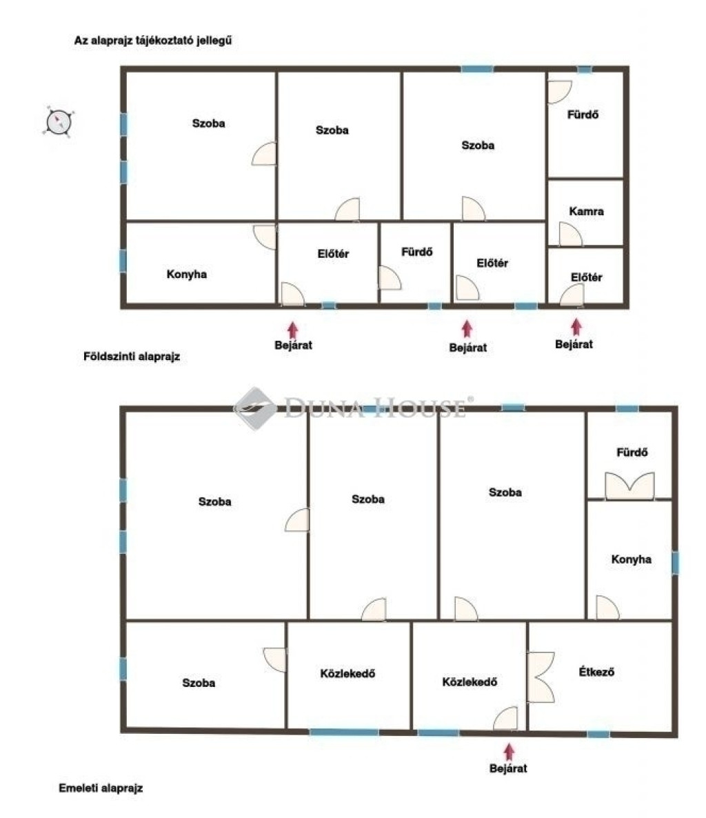 Felső szint: 4 szoba, konyha, fürdő, kamra, étkező és közlekedő