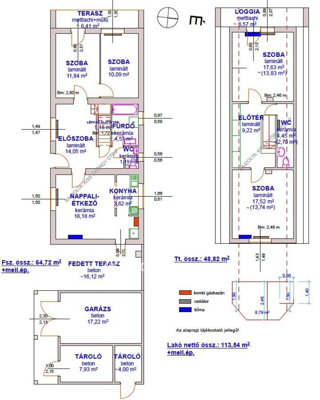 Fűtés: kombi gázkazán radiátorokkal, 3 hűtő-fűtő klíma.