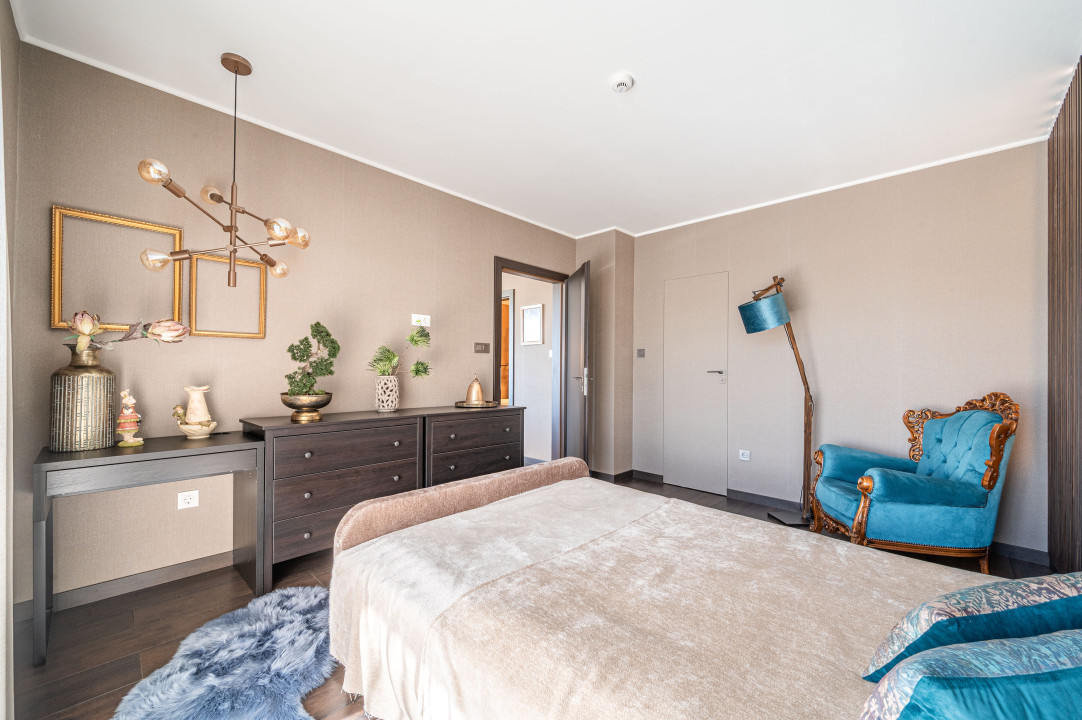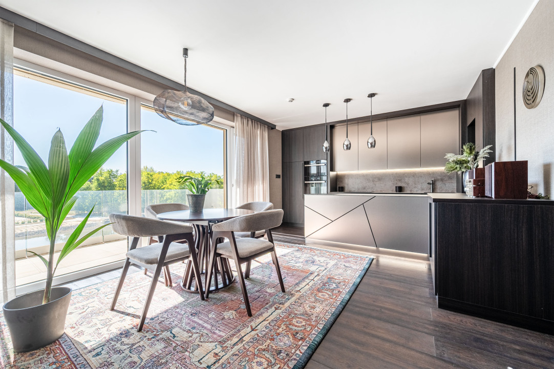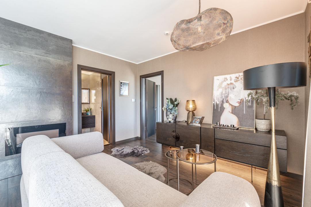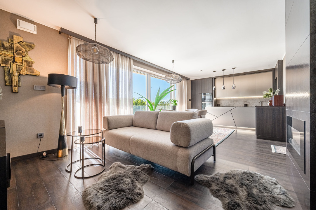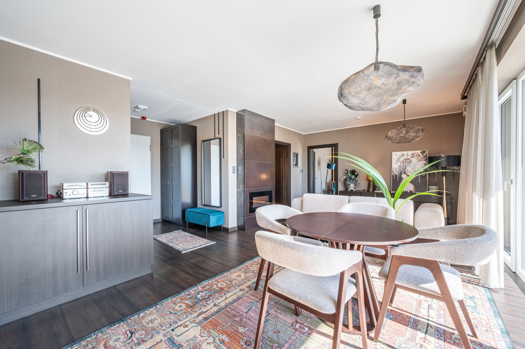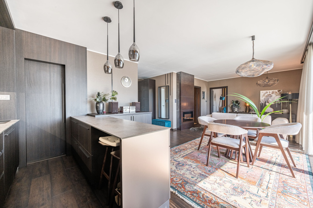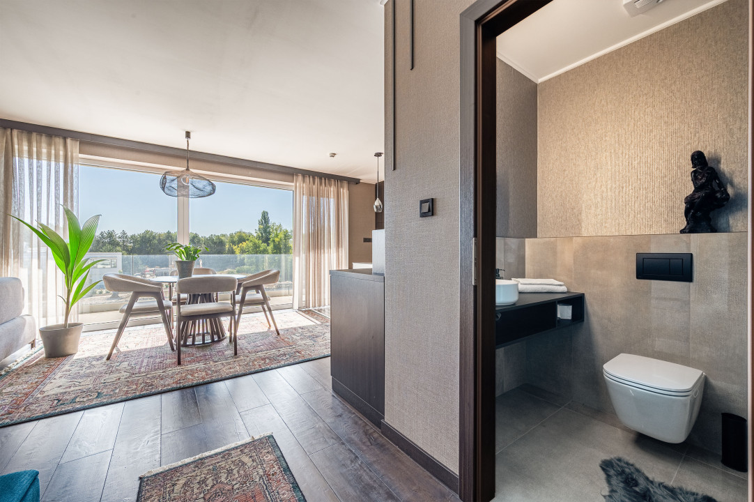 The apartment is one of the three largest apartments in the building. The interior was designed by the owner herself, sparing no expense, time or energy – it is not equipped with standard fixtures and fittings. The apartment has ceiling cooling, underfloor heating, Austrian electric shutters, a premium custom-made kitchen, stone countertops, high-quality Italian flooring, and Bugnatese sanitary ware.