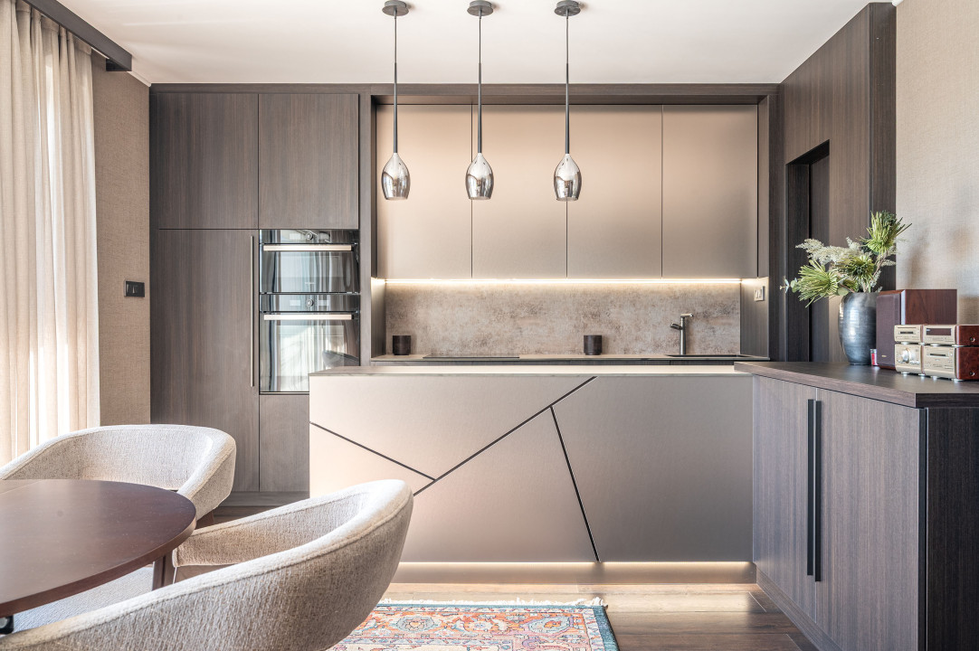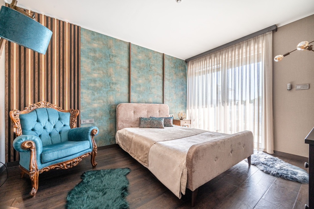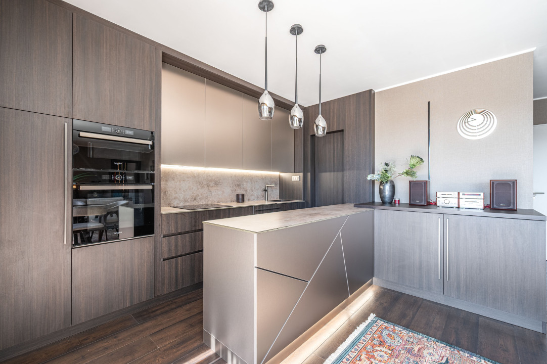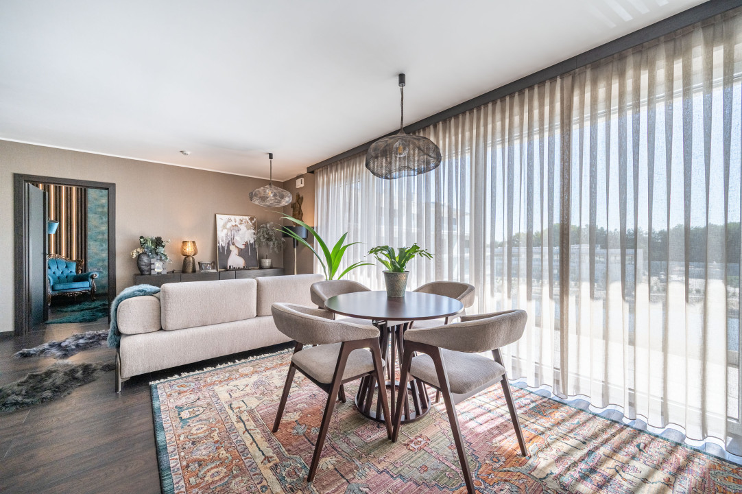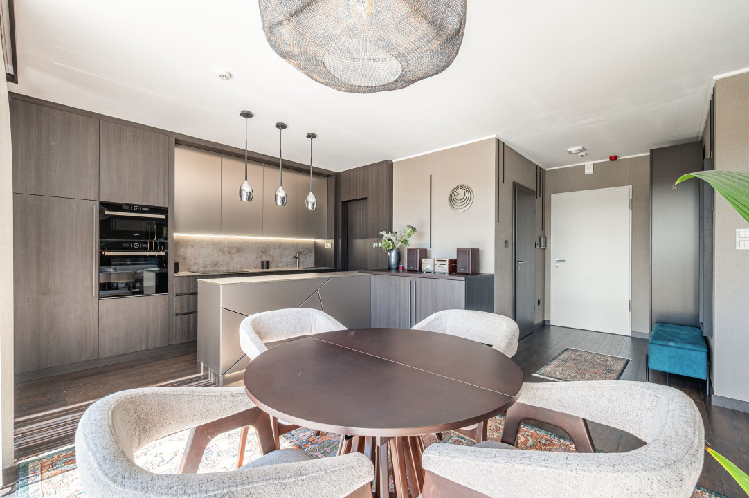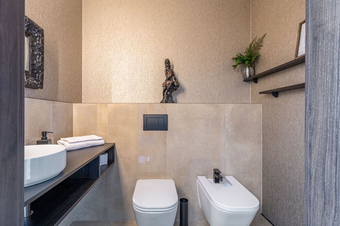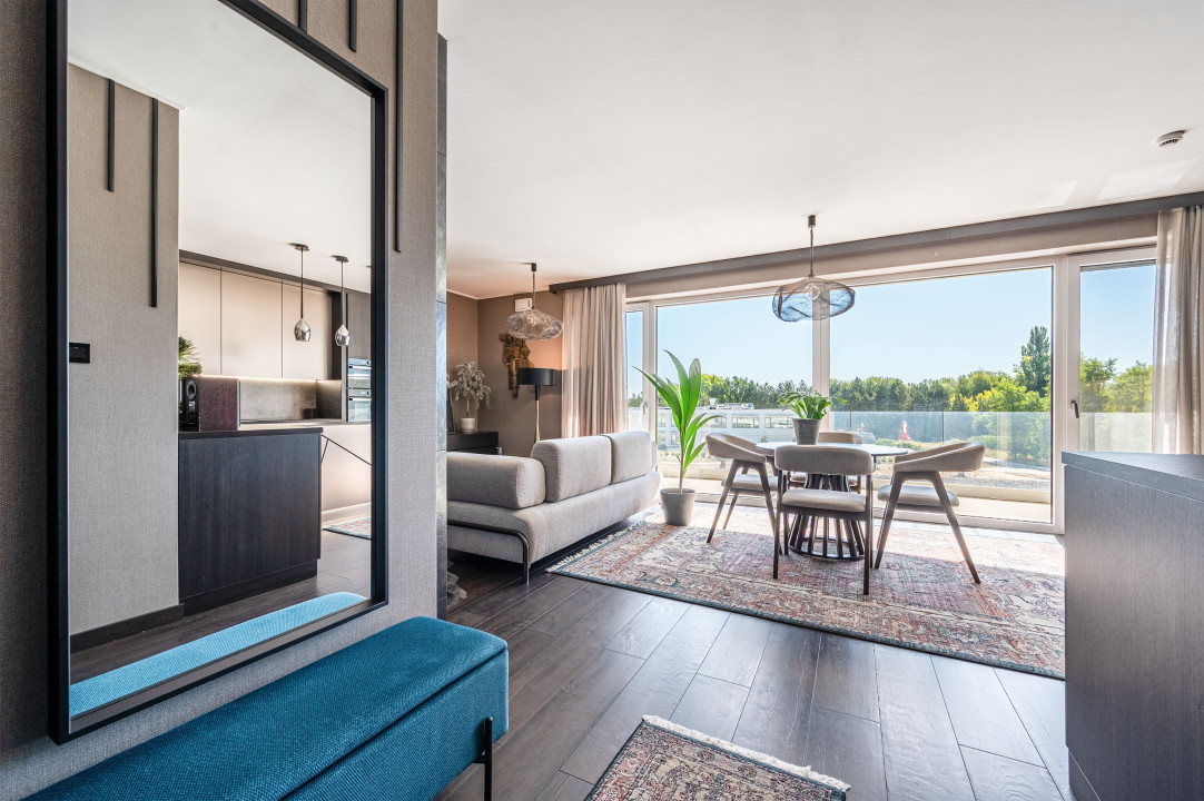 The apartment is one of the three largest apartments in the building. The interior was designed by the owner herself, sparing no expense, time or energy – it is not equipped with standard fixtures and fittings. The apartment has ceiling cooling, underfloor heating, Austrian electric shutters, a premium custom-made kitchen, stone countertops, high-quality Italian flooring, and Bugnatese sanitary ware.