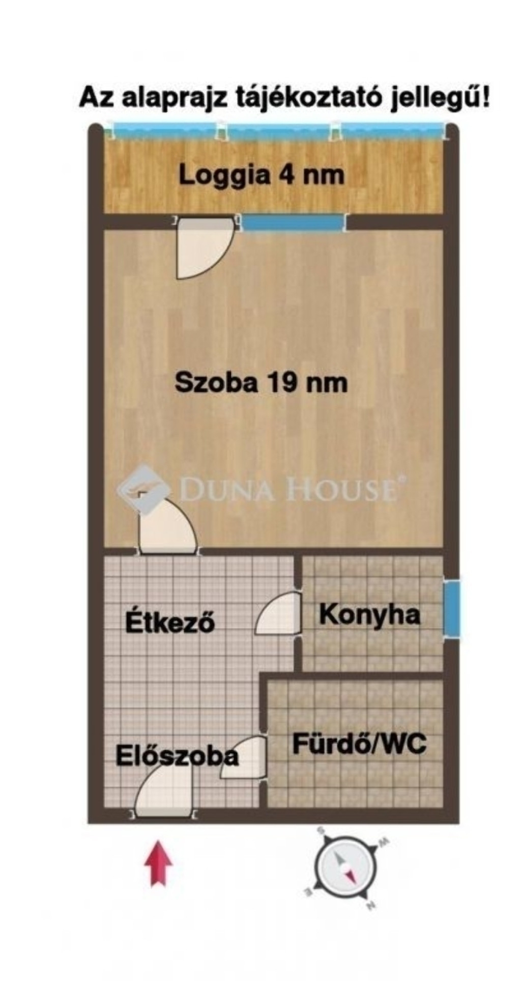 A lakás helyiségei: nappali/szoba 19 nm, konyha 3,5 nm, étkező 3,5 nm, fürdő-WC 3,5 nm, előszoba 2,5 nm.