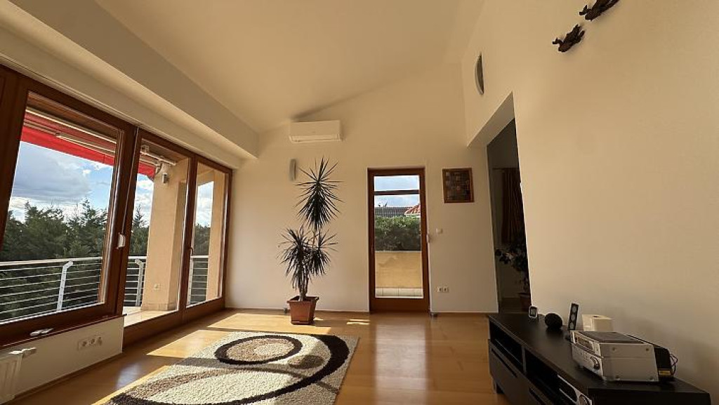 A nappaliból nyílik egy 15 nm-es délnyugati fekvésű, gyönyörű panorámával rendelkező, félig fedett, motoros árnyékolóval ellátott terasz, illetve szintúgy a nappaliból közelíthetjük meg az oldalsó, nyugati fekvésű 5 nm-es, teljesen fedett erkélyt.