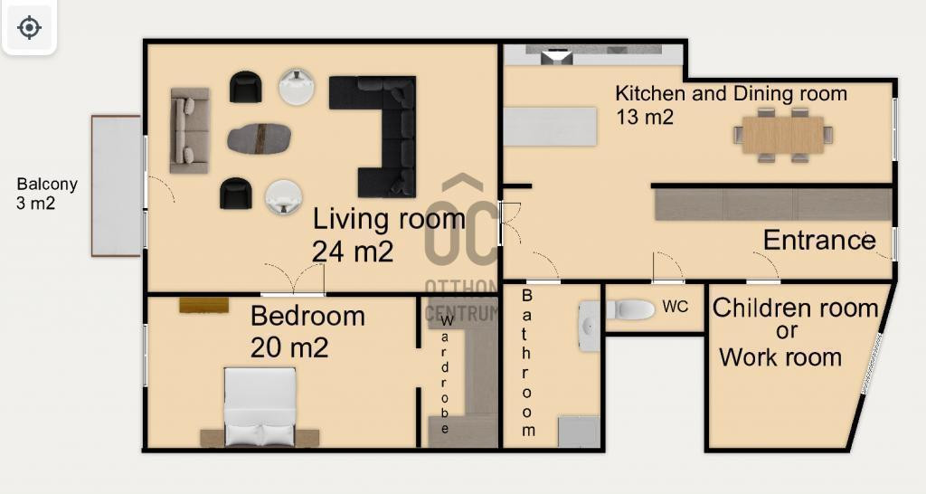 - Felosztása: közlekedő, konyha-étkező, nappali, hálószoba, félszoba, fürdőszoba, wc, erkély.