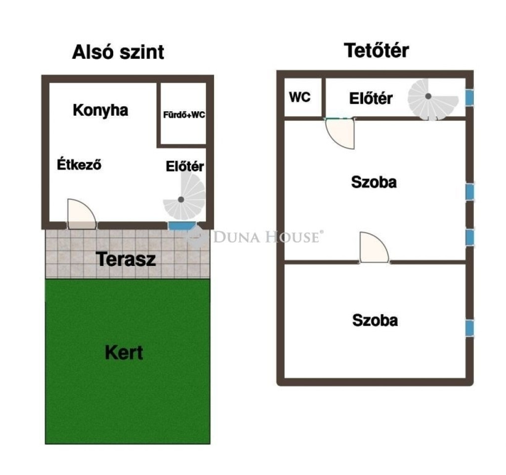 Az alsó szinten: konyha-étkező, előtér, fürdő