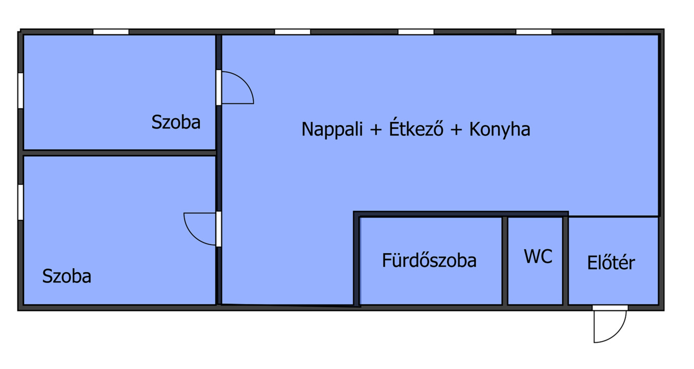 Szobák: 2 külön nyíló szoba, Nappali + Étkező + Konyha, WC, Fürdőszoba, Előtér