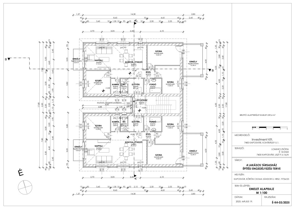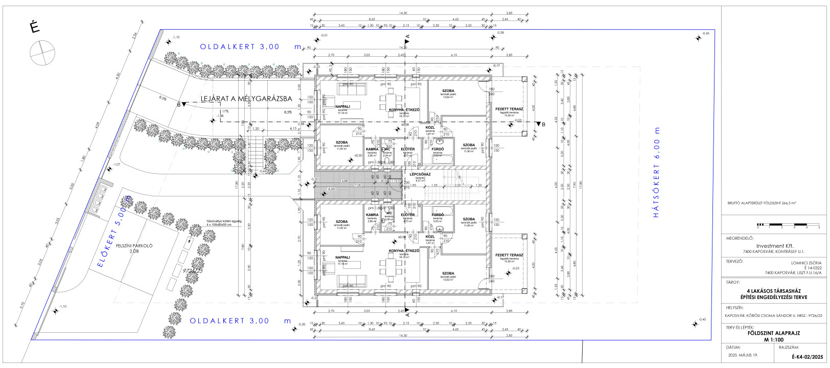 Kaposváron a Kecelhegyi városrészben, a Kőrösi Csoma Sándor utcában, új építésű, exkluzív - magas minőségben kivitelezett, korszerű építőanyagokból épülő, energiatakarékos társasházban - 4 db lakás eladó. A társasház földszintjén 2 db 97,91 m2-es lakás, míg az 1. emeleten 2 db 96,13 m2-es lakás kerül kialakításra. Minden lakásban előszoba, nappali - terasz vagy erkély - konyha, 2 szoba, fürdőszoba-wc helyiség lesz kialakítva, továbbá tartozik minden lakáshoz önálló tároló és egy felszíni parkoló, illetve a mélygarázsban 2 db beálló, elektromos autótöltővel, amelynek értéke 5.000.000.- Ft. A kerítés kialakítása oly módon történik, hogy a felszíni parkolót kapunyitás nélkül is meg lehessen közelíteni. A korszerű, modern energetikájú - ezáltal alacsony rezsivel rendelkező - épület fűtése és hűtése levegő-víz hőszivattyúval lesz biztosítva, napelemes támogatással, továbbá fan-coil rendszer szolgáltatja az igényelt hőmérsékletet a lakásban. A hőszigetelt faszerkezetű nyílászárókhoz zsaluziák lesznek felszerelve, illetve prémium minőségű szaniterek és szerelvények, illetve csapok kerülnek beépítésre. A megállapodás szerint a konyhabútort (bútorlapból) az eladó fogja legyártatni és a vételár tartalmazza azt. A lakáshoz tartozó önálló udvar mérete lakásonként 200 m2. A lakások az ideális lokáció miatt jó választás lehet családoknak és befektetőknek egyaránt - élelmiszerbolt, iskola, óvoda és buszmegálló gyalogos távolságban percek alatt elérhető. Az épület teljes kivitelezése és a műszaki átadása várhatóan 2026. IV. negyedévben történik meg. Energetikai besorolás: A