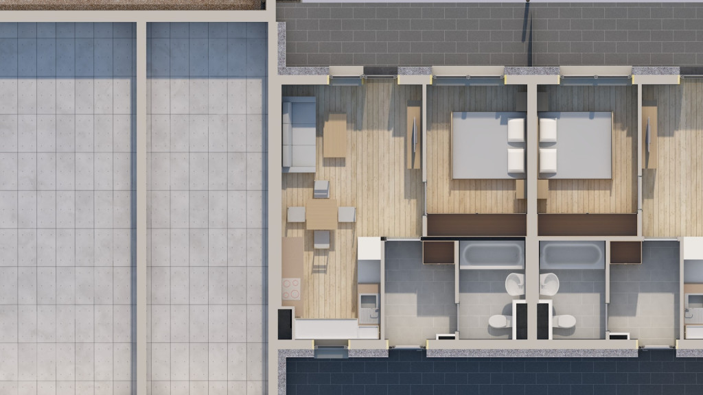 A földszinten 16 db garázs, 36 db fedett parkoló és 28 db kültéri parkoló található, ezekből opcionálisan választható, de legalább 1 db gépkocsi beálló vásárlása kötelező. Ezen kívül minden szinten privát tároló vételére is van lehetőség.