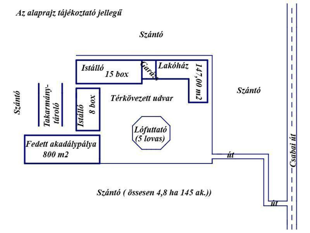 Békés vármegye, BÉKÉSCSABA határában, a megyei jogú várostól 4 km-re, 5 hektáros szántóval, 150 m2-es felújított tanyával, 23 lovas bokszokkal rendelkező LOVASTANYA, teljes felszereltségével együtt ELADÓ! A 2500 m2 telekterületű tanyához tartozik egy 110 m2-es tetőteres lakóépület, valamint a hozzáépített 40 m2-es személyzeti szálás, 25 m2-es garázs, egy 15 bokszos és egy 8 bokszos lóistálló, egy 800 m2-es négy-évszakos világított fedett lovaspálya, egy lómosó és lószolárium, valamint fedett takamánytároló, és egy 5 lovas elektromos jártató. A hőszigetelt, légkondicionált tanyaépületben egy igényesen kialakított, komplett, 2 lakószintes, összesen 110 m2 alapterületű lakás található, mely 2019-ben lett felújítva. A földszinten 1 szoba, konyha - étkező, sarokkádas fürdőszoba és a külön WC található. A tetőtér 2 szoba, közlekedő, erkély kialakítású. A személyzeti száláson, 1 szoba, konyha ? étkező, zuhanykabinos fürdőszoba, és külön WC található. A helyiségek laminált padlóval illetve járólappal burkoltak. A fűtés vegyes-tüzelésű kazánról történik, radiátoros hő leadással. A meleg vizet elektromos bojler biztosítja. A villamoshálózat felújítása is megtörtént, 3 fázis került bevezetésre. A szennyvízelvezetés is megoldott. A közel 5 hektáros 144. aranykorona értékű szántón a lovak etetésére szolgáló takarmány helyben megtermelhető! Csendes, nyugodt, környezetben, teljes lovas infrastruktúrával felszerelt lovarda várja új tulajdonosát! Az ingatlan a közútról jól megközelíthető, a kőzúzalékkal kihordott saját használatú úton. Az ügyvédi munka és hitelügyintézés szintén szolgáltatásunk része, így Ön sokkal eredményesebben fog célba érni. Ha bármi kérdése felmerül az ingatlannal kapcsolatban, vagy meg szeretné tekinteni, kérem, hívjon az elérhetőségemen bármikor, örömmel mutatom meg ezt a kivételes ingatlant! ----------------------Az OTP Ingatlanpont teljes körű ügyintézéssel áll az eladók és a vevők rendelkezésére! A vásárlás finanszírozásában az OTP kedvező hitelkonstrukcióival, akár a babaváró hitel ilyen célra történő felhasználásával tud segíteni. Ingatlant kereső ügyfeleink részére szolgáltatásaink és az ingatlanvásárlással, ingatlan felújítással kapcsolatos hitel ügyintézése ingyenes. Az adásvételi szerződés megkötéséhez igény szerint megbízható ügyvédi közreműködést biztosítunk, és segítséget nyújtunk az adásvételhez kapcsolódó ügyek intézéséhez.