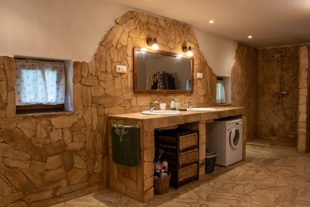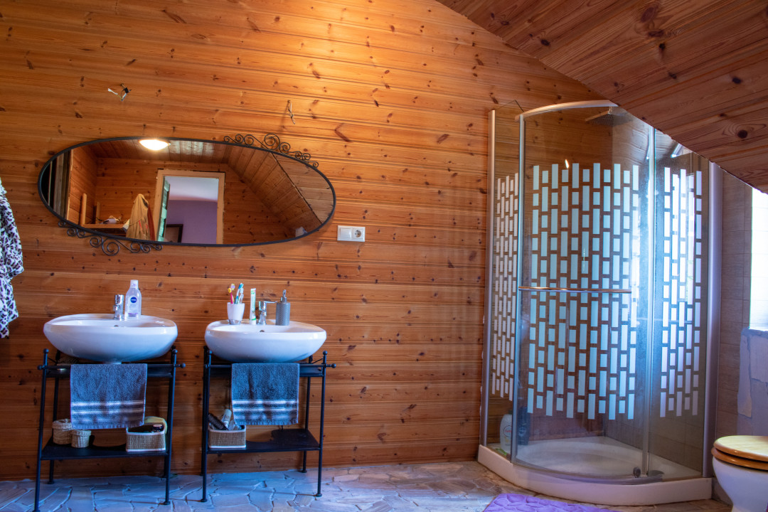 Napelemrendszer + napkollektor. Padlófűtés, falfűtés, kandalló. Saját fúrt kutak, ivóvíz minőségű vízzel
