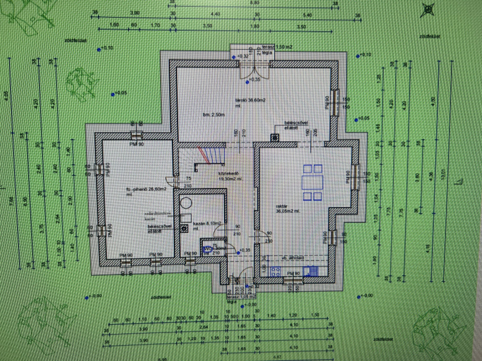 Földszint: hatalmas, világos nappali–konyha–étkező egy légtérben, két kertkapcsolatos kijárat, komplett fürdő (kád + zuhanyzó + bidé), előszoba, gépház.