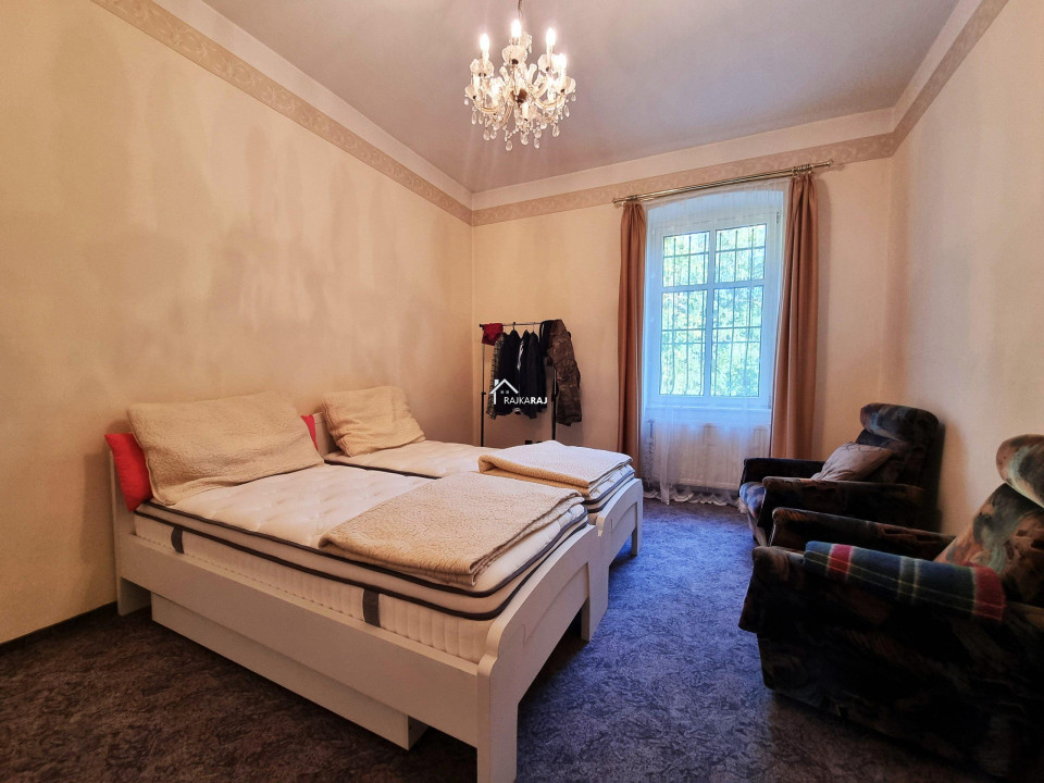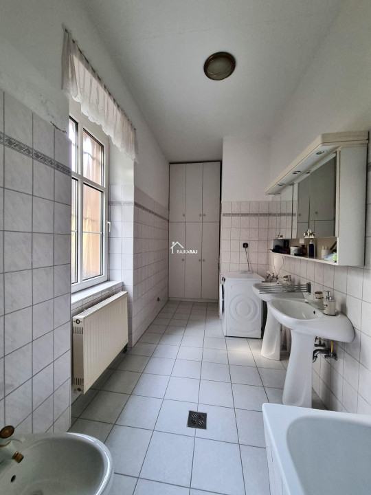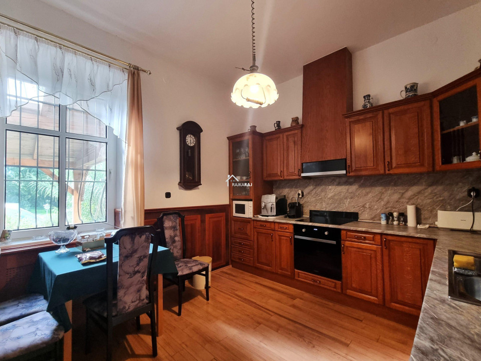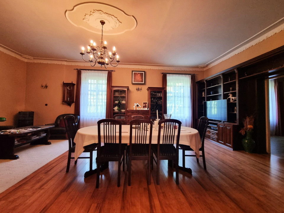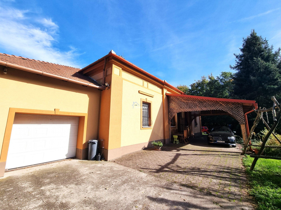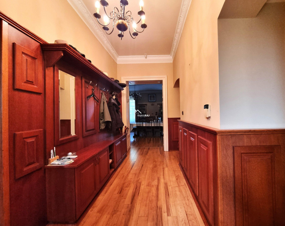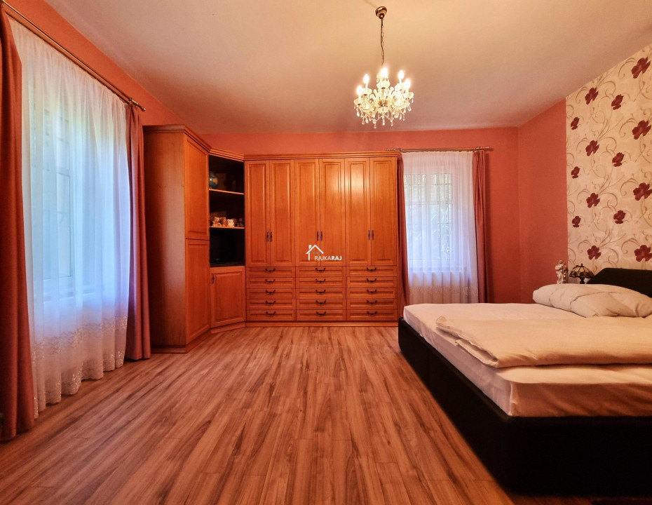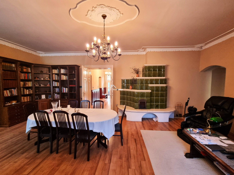 A LAKÓÉPÜLET HELYISÉGEI: előtér, konyha/étkező helyiség valamint innen nyíló spejz, 4 nagyméretű szoba, hatalmas társalgó/nappali tér, 2 kádas fürdőszoba + az egyik fürdőben zuhanykabinnal bidével + 2 wc-vel. Az épület előtt 48 m2-es fedett terasz található. Mellette 40 m2-es zárt dupla garázs áll. A ház alatt 42 m2-es pince van. A lakóépület belmagassága 320 cm.