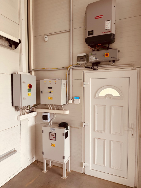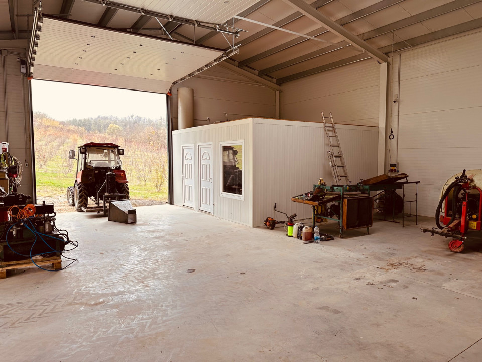 A területen található egy 320 m²-es raktárépület, amely hűtőházzal és szociális helyiségekkel felszerelt. Az épület energiaellátását 10 kW-os napelemrendszer, valamint 3×32 A ipari áram biztosítja.