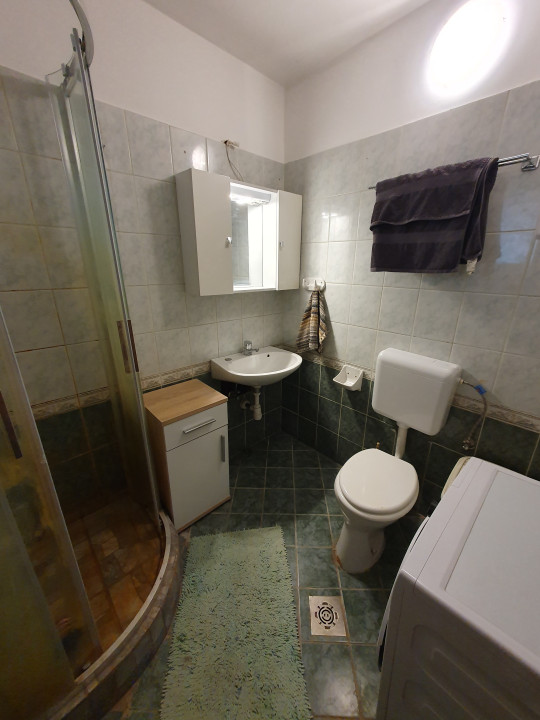 fürdőszoba zuhanyzóval és WC-vel.
