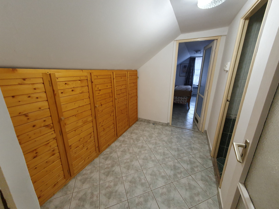 A felső szint teljesen különálló és kívülről közelíthető meg. A két szobát egy beépített szekrényes folyosó köti össze, amiből egy zuhanyzós fürdőszoba nyílik WC-vel.