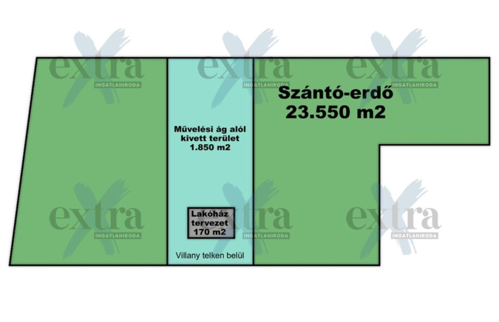 A terület összesen 23.550 m2, ebből 14.020 m2 SZÁNTÓ és 9.530 m2 ERDŐ, így a mezőgazdasági és erdőgazdálkodási lehetőségek KIEGYENSÚLYOZOTTAN jelennek meg. A teljes területből 1.850 m2 MŰVELÉSI ÁG ALÓL KIVETT rész, amelyre ENGEDMÉNYES TERV áll rendelkezésre egy 170 m2-es CSALÁDI HÁZ építésére – átgondolt, PRAKTIKUS alap a jövőbeli fejlesztéshez. Az építési terület TELJESEN KERÍTETT, a VILLANY a telken belül (3 FÁZIS), ami JELENTŐS ELŐNY a kivitelezés és az üzemeltetés során.