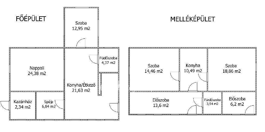Két lakóépület (70,1 m2 + 67,2 m2), napelemmel, kamerával, magasfeszültségű ipari árammal.
