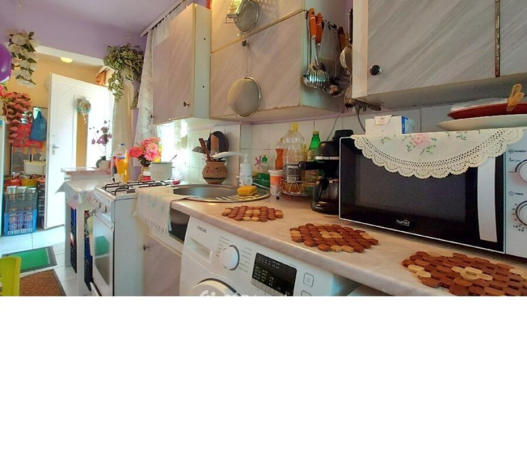 A szoba szőnyeg padlóval, a többi helység hideg burkolattal van ellátva. A külső homlokzat 5 cm-es hőszigetelést kapott.