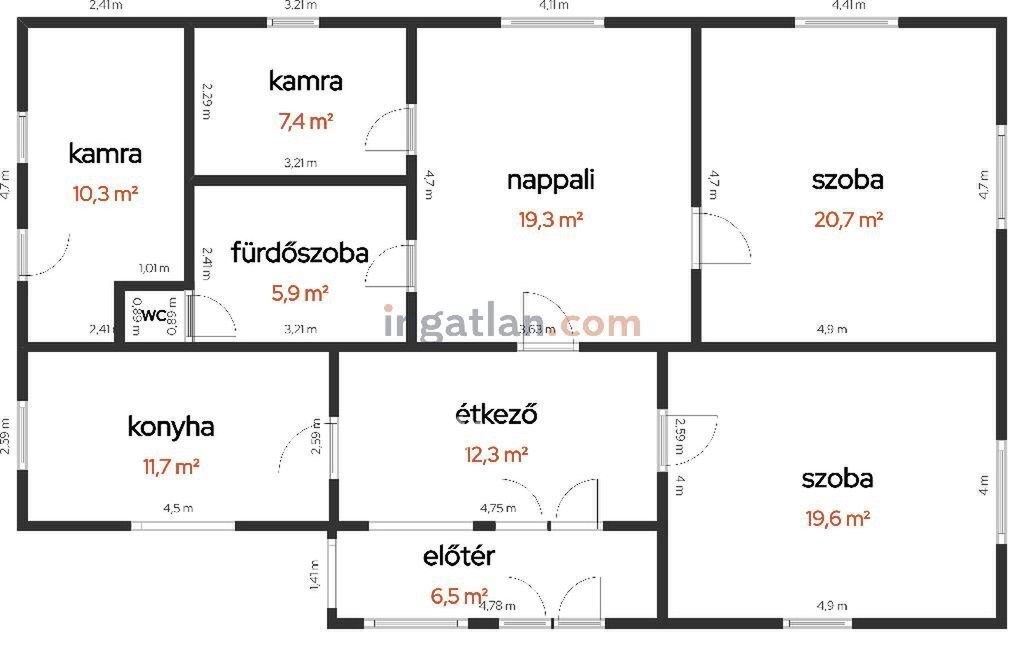 A lakóingatlan 115,7 nm hasznos alapterületű, tartozik hozzá 2 szoba + nappali, étkező, konyha, 2 kamra, fürdőszoba + külön WC.