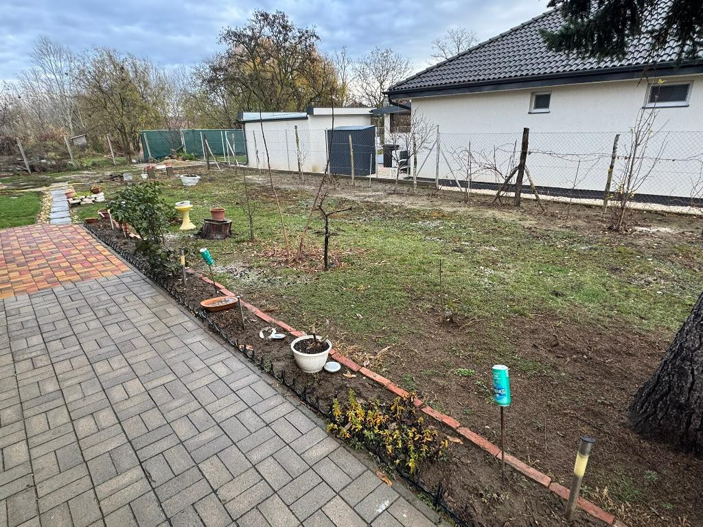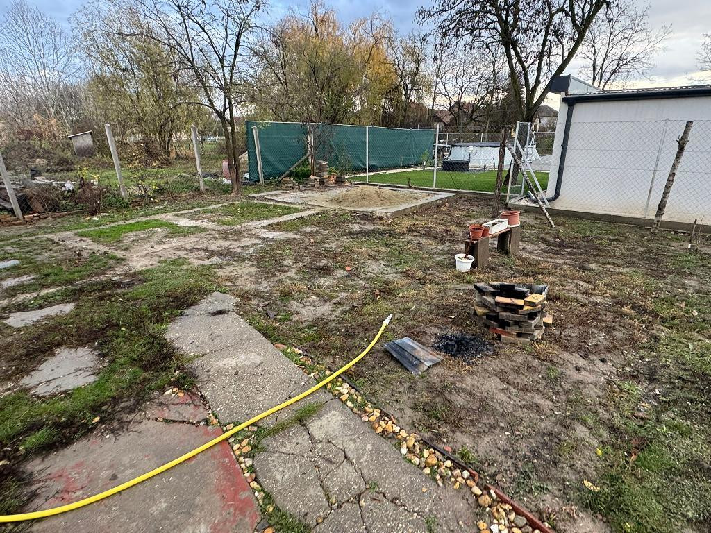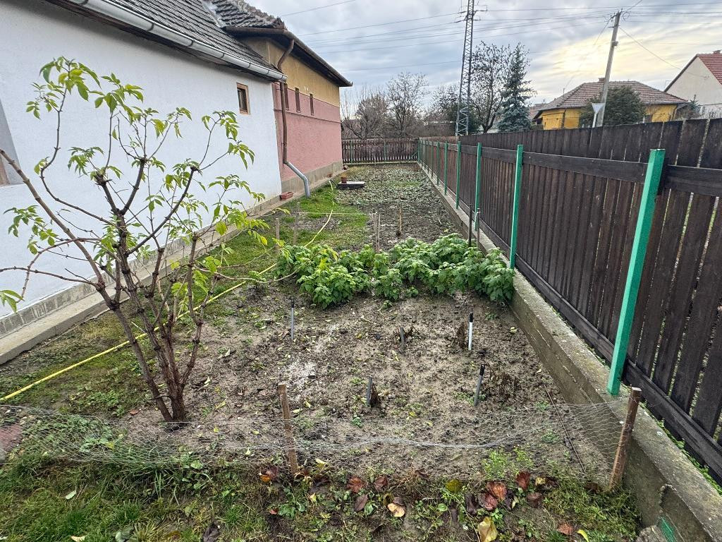 Udvara körbekerített, rajta: kerti csap, ásott kút, gyümölcsfák (meggy, szilva, körte, alma, barack).
