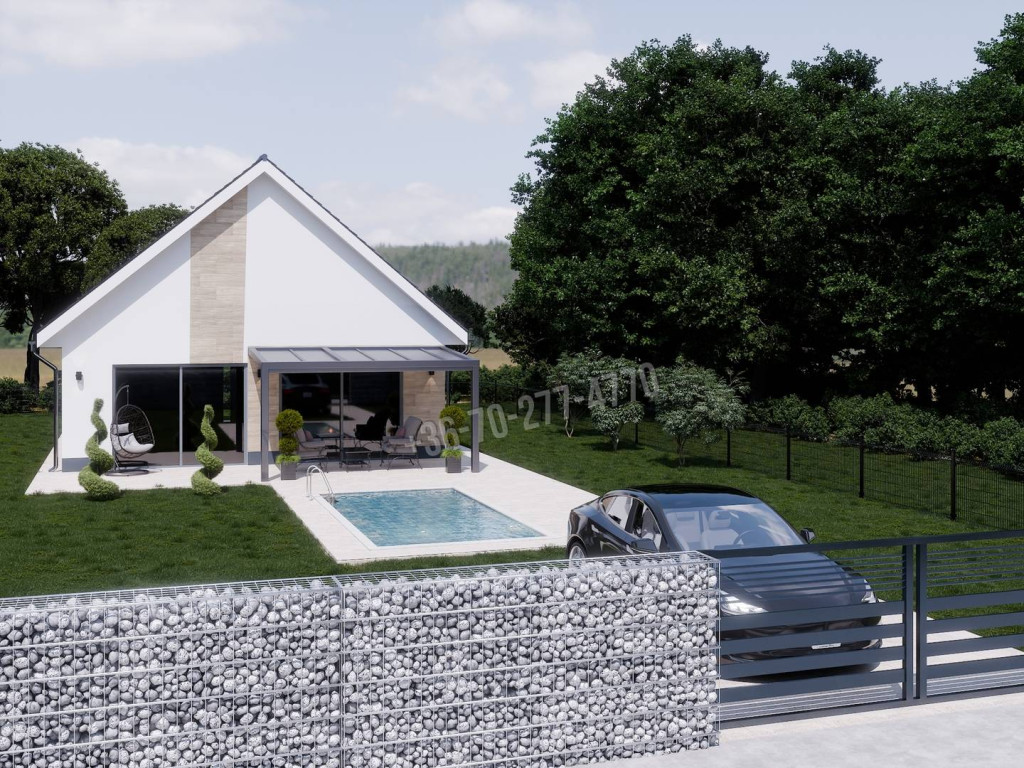 Az utcafronti kerítés egy alacsony „Gabion-fal” lesz, a tájpanorámát nem takarja majd el. Az udvarba autóval egy elektromos úszókapun keresztül be is tudunk majd hajtani. Kerti csap illetve zuhany igény esetén kiépítésre kerül.