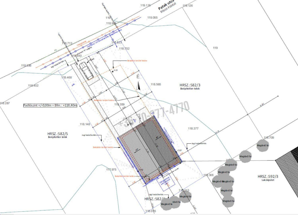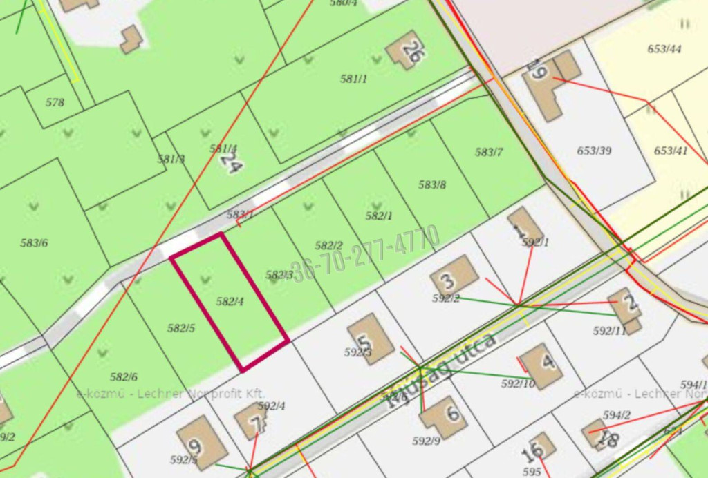 Új belterületi, kis forgalmú utcában kialakított Lke01 besorolású szinte sík terület. A körbekerített 607 m2-es telek beépíthetősége 30%. Közművek tekintetében a víz, csatorna, villany elérhető, bevezetésre került. Az utca, a telkek a közelmúltban lettek kimérve, új építésű házak kezdenek épülni, már az utcakép is az igényes lakóövezetről fog árulkodni.