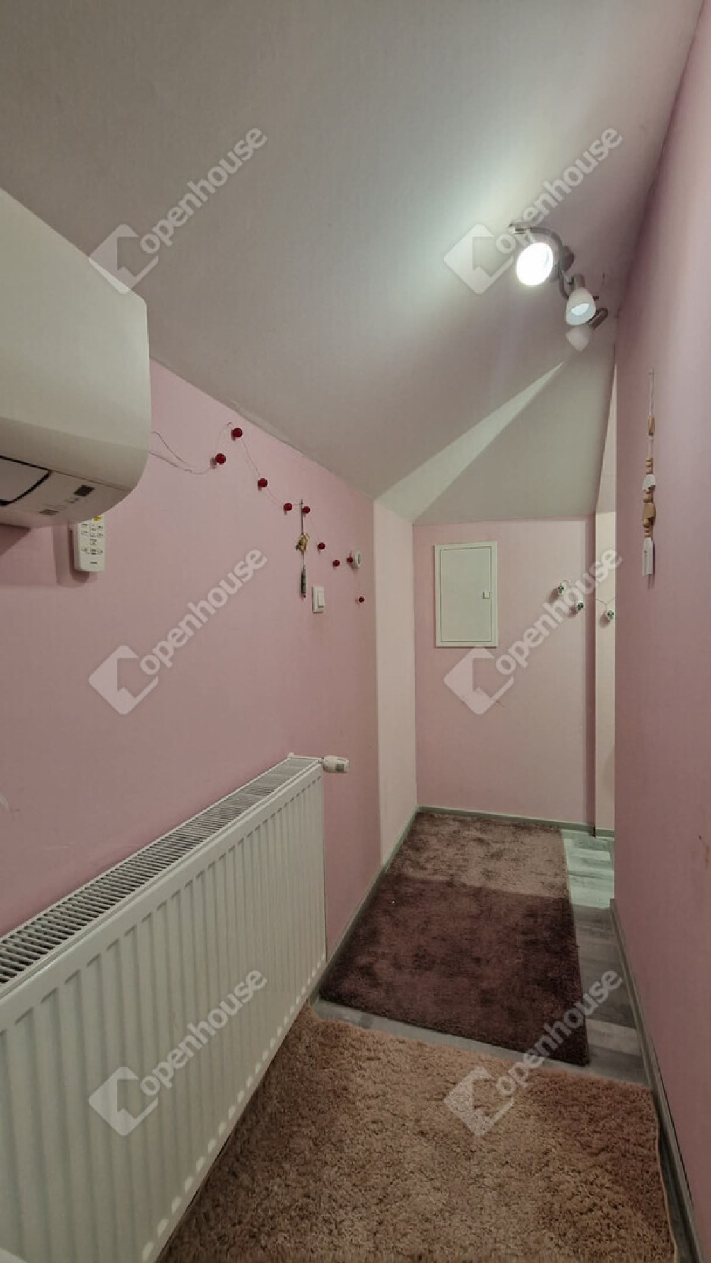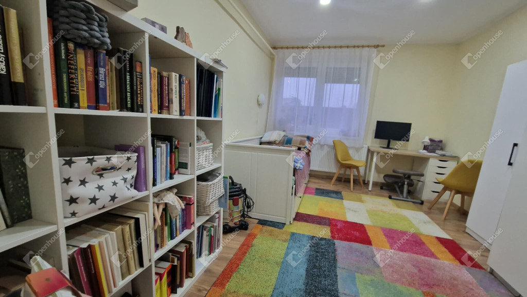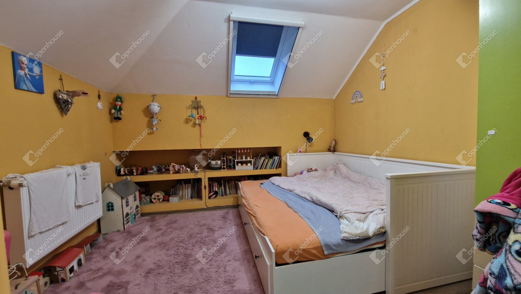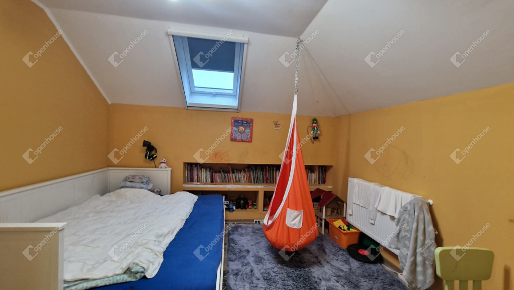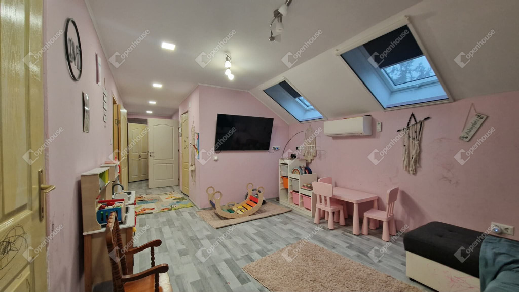 Tetőtéri szintjén - közlekedő, nappali, fürdőszoba külön wc illetve három külön nyíló közel 10 m² méretű vidám gyerekszoba került kialakításra. A nappali részén ha az új tulajdonos igényelne egy konyhai részt, ennek előkészítése megtörtént.