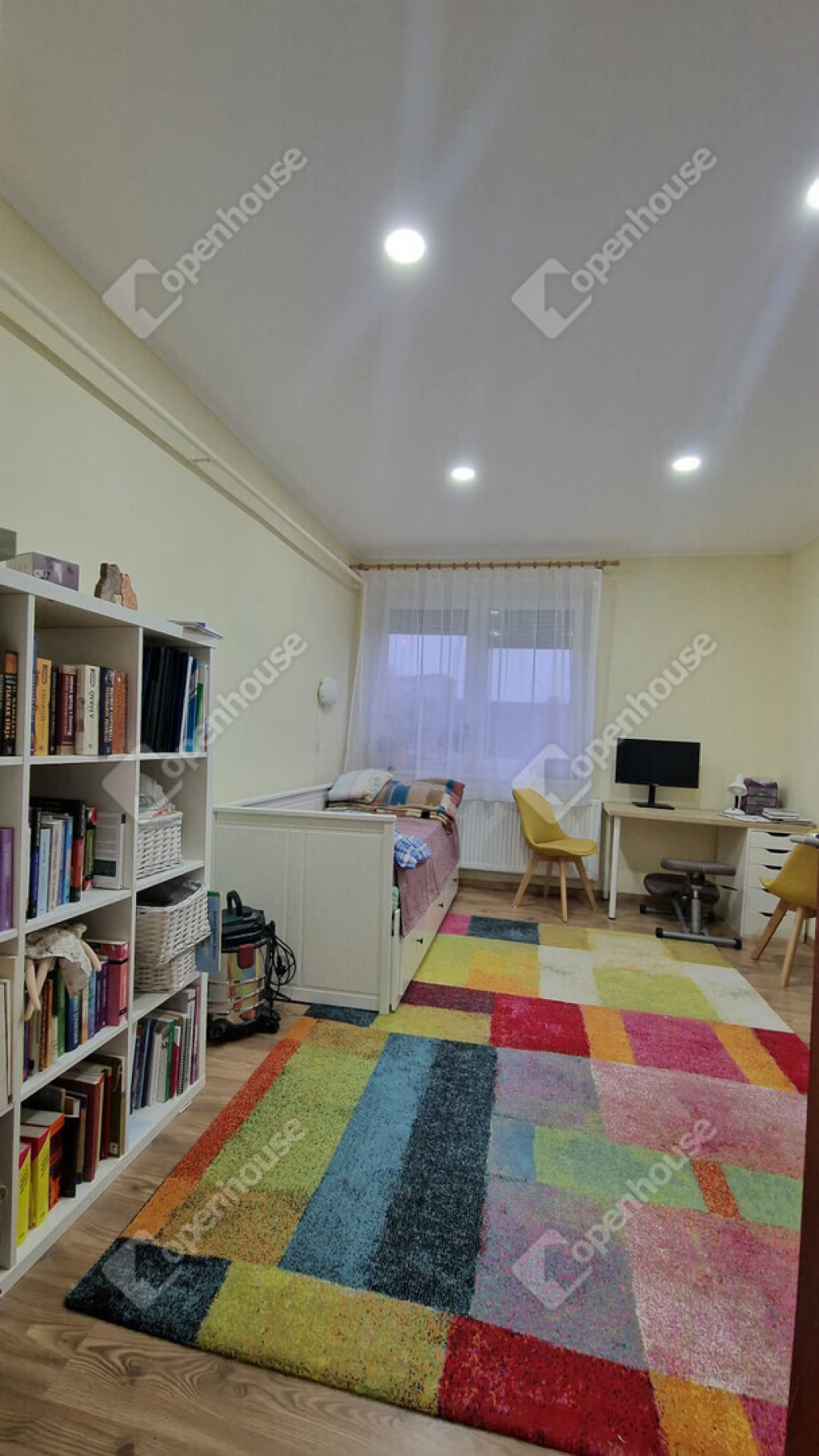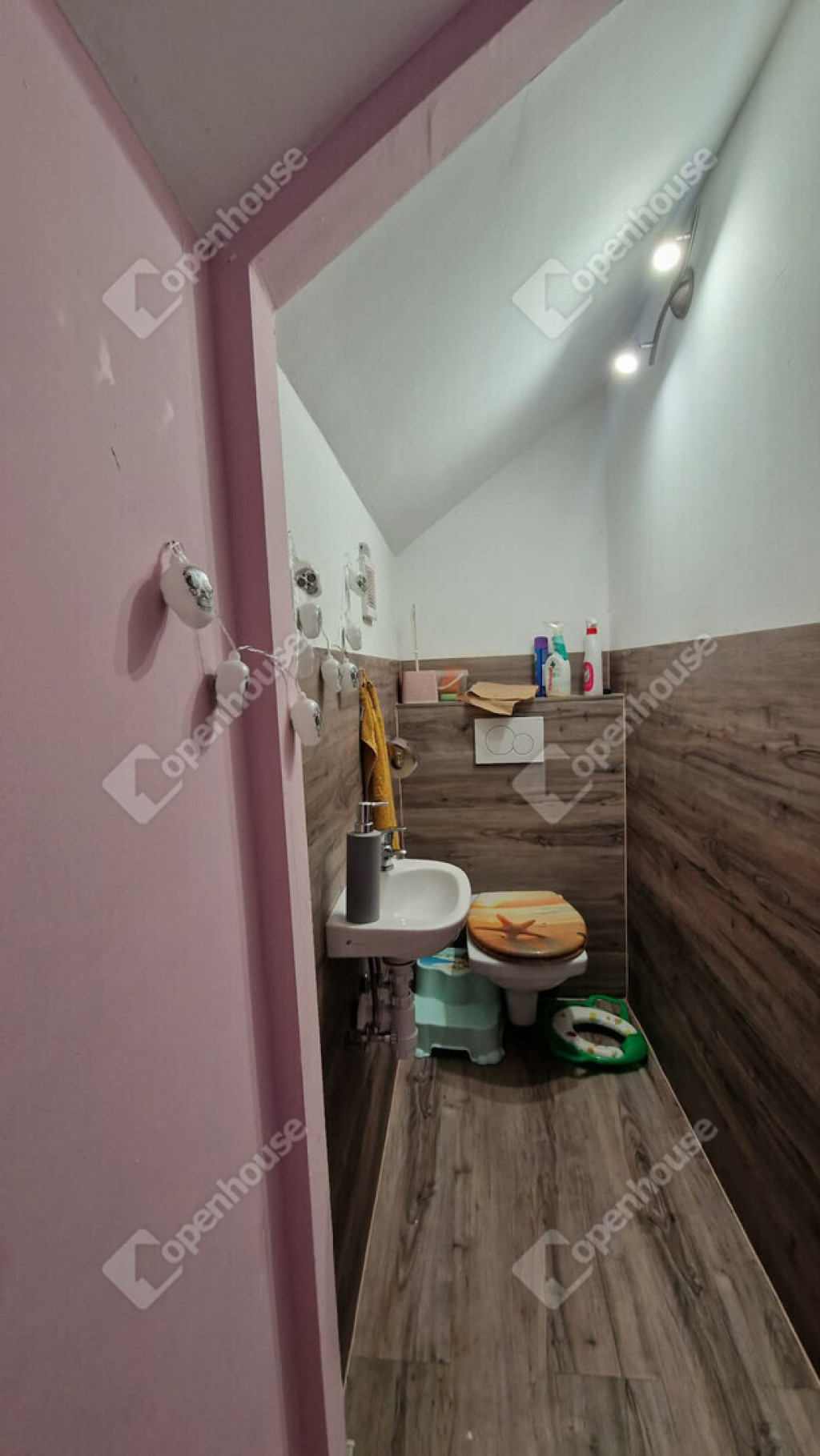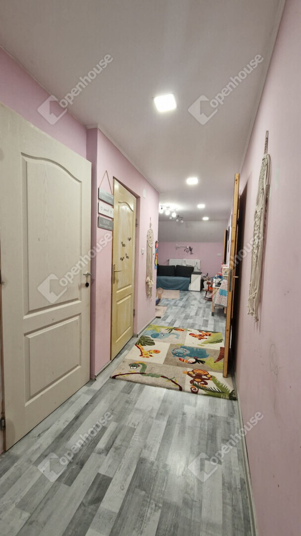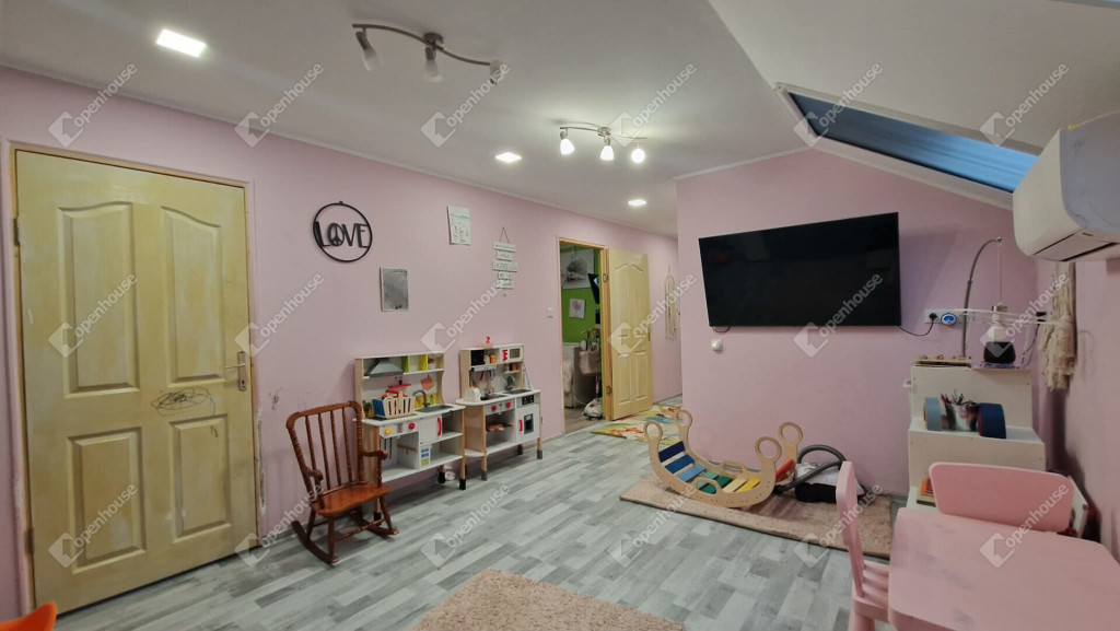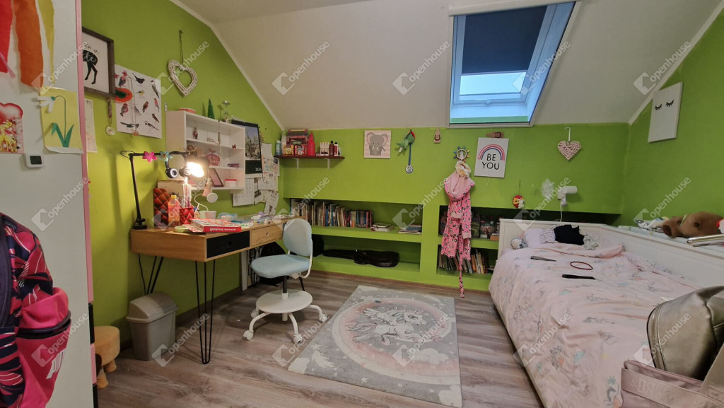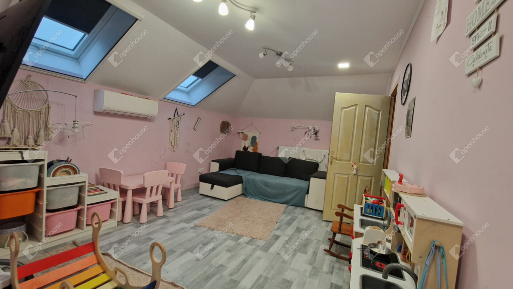 Tetőtéri szintjén - közlekedő, nappali, fürdőszoba külön wc illetve három külön nyíló közel 10 m² méretű vidám gyerekszoba került kialakításra. A nappali részén ha az új tulajdonos igényelne egy konyhai részt, ennek előkészítése megtörtént.