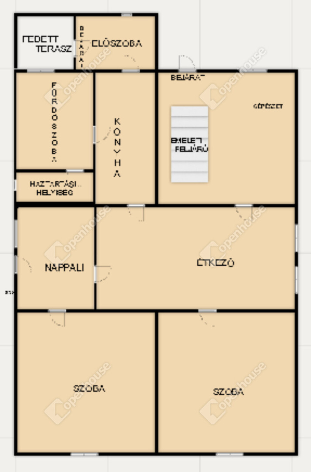 Előszoba, konyha, fürdőszoba, háztartási helyiség, étkező, nappali két kényelmes méretű szoba. Étkezőből nyílik a lépcsőház, ahonnan a tetőtéri szint megközelíthető illetve a gépészet is itt található. Ebből a helyiségből az udvar felé szintén adott egy kijárat.
