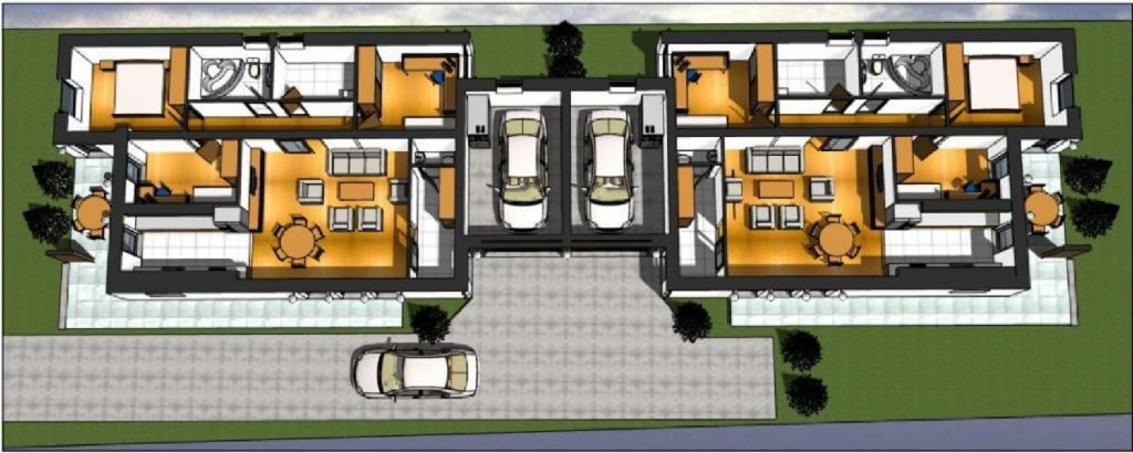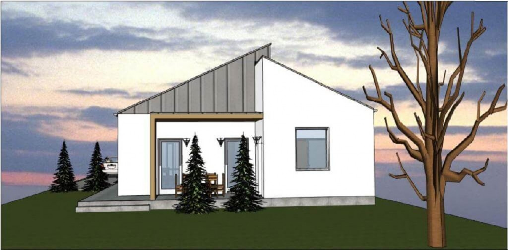 A tervek alapján a ház helyiségei: előszoba, amerikai konyhás-étkezős nappali + 3 hálószoba, fürdőszoba, háztartási helyiség, vendégmosdó, nyitott és fedett terasz, valamint zárt garázs.