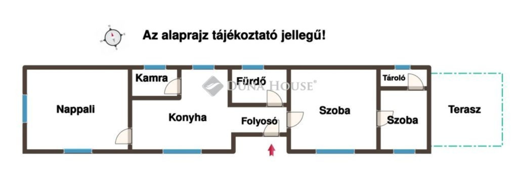 Felosztás szempontjából nappali plusz kettő szobából áll, amiből az egyik fél szoba, ebből nyílik egy kis tároló.
