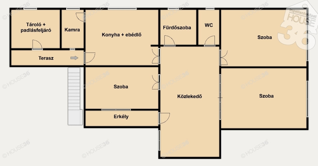 Az épület felső szintjén, kb. 120 m2-en a lakórész található: 3 tágas szoba, közlekedő, konyha ebédlővel, vizesblokk, kamra, udvarra néző terasz és erkély. A ház alsó szintjén, több mint 100 m2 területen pince, műhely, tárolók nyertek elhelyezést.
