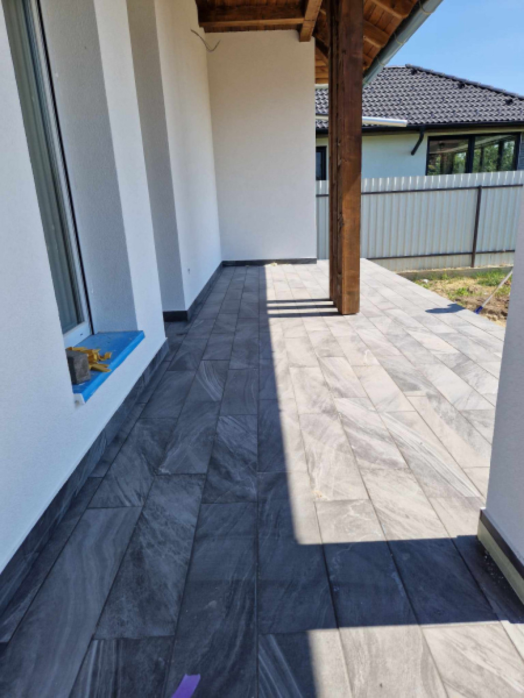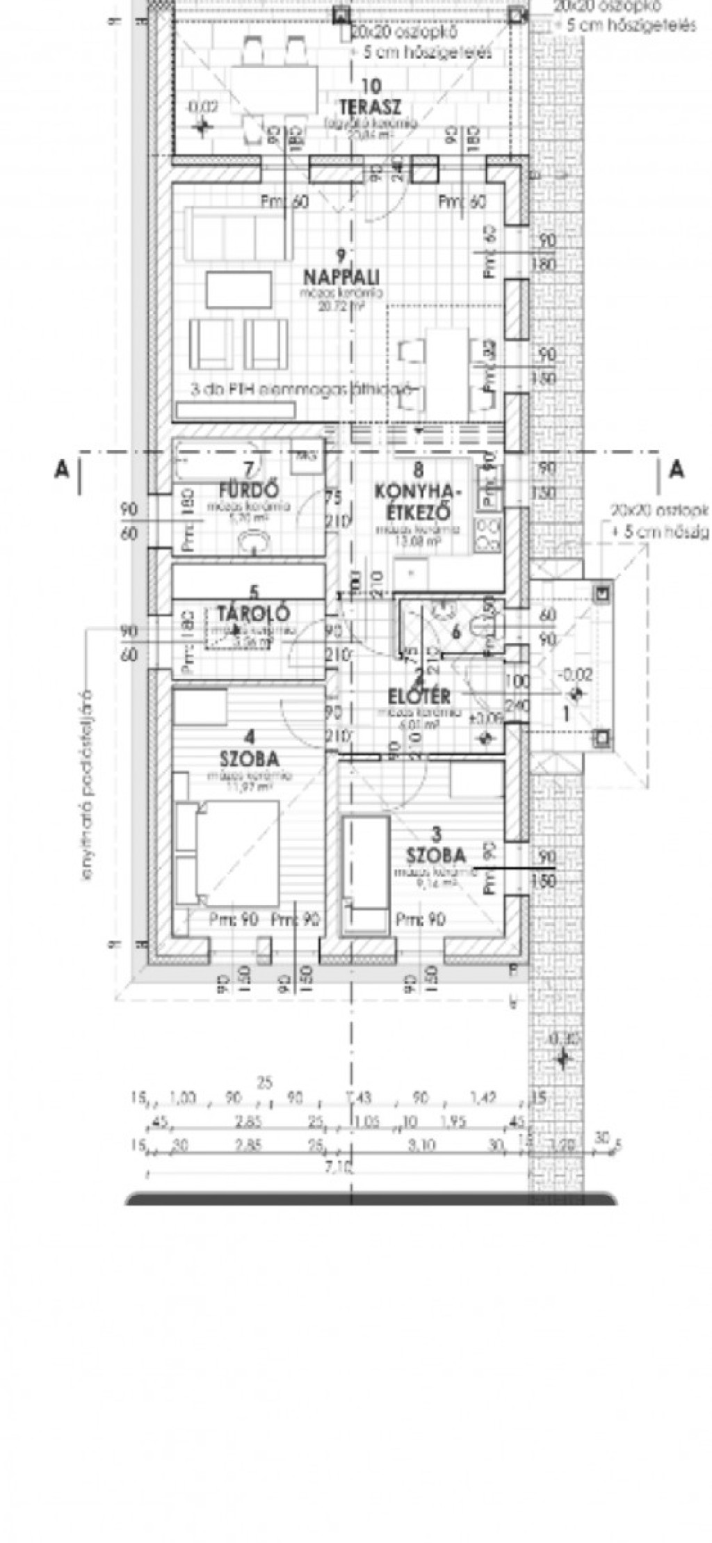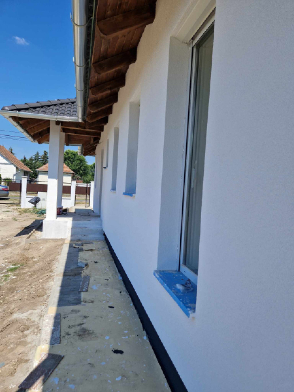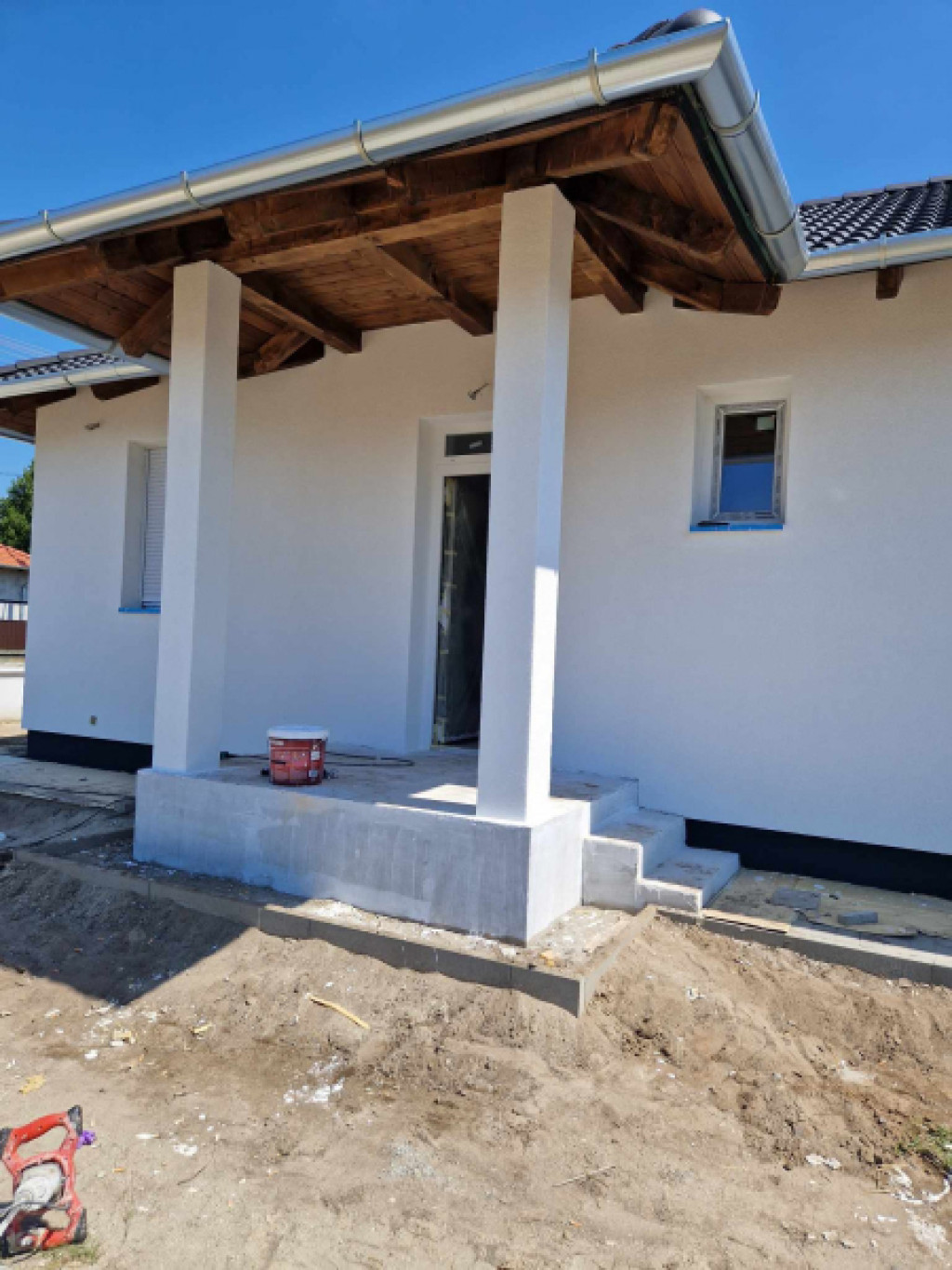 Az épület 74 nm + 15 nm-es terasz. Betonsáv alapra épül, födém felett és tetősíkon hőszigetelés, Porotherm téglából, Fa födémmel, sátor tetővel Terrán betoncserép héjazattal. Lábazati és homlokzati szigeteléssel. A külső nyílásrárők fehér műanyagból készülnek hőszigetelt üvegezéssel. Belső ajtók fából kerülnek 70.000 Ft értékben beépítésre.