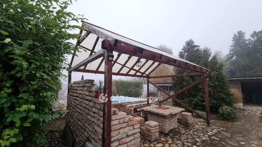 -Dupla garázs, tárolók, bográcsozó, épített medence.
