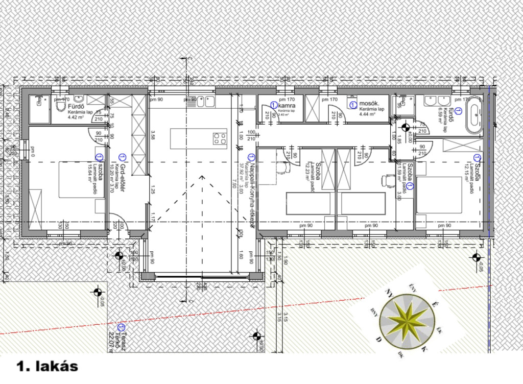 - Elrendezés: 4 hálószoba + nappali + 2 fürdő + kamra + háztartási helyiség