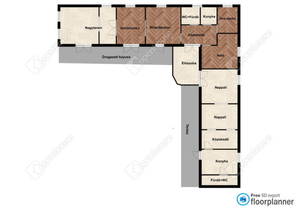Tágas Terek: A 270 m²-es főépület 13 helyiségből áll, beleértve 7 szobát, 2 konyhát és 2 fürdőszobát. Az egész épület világos és tágas.
