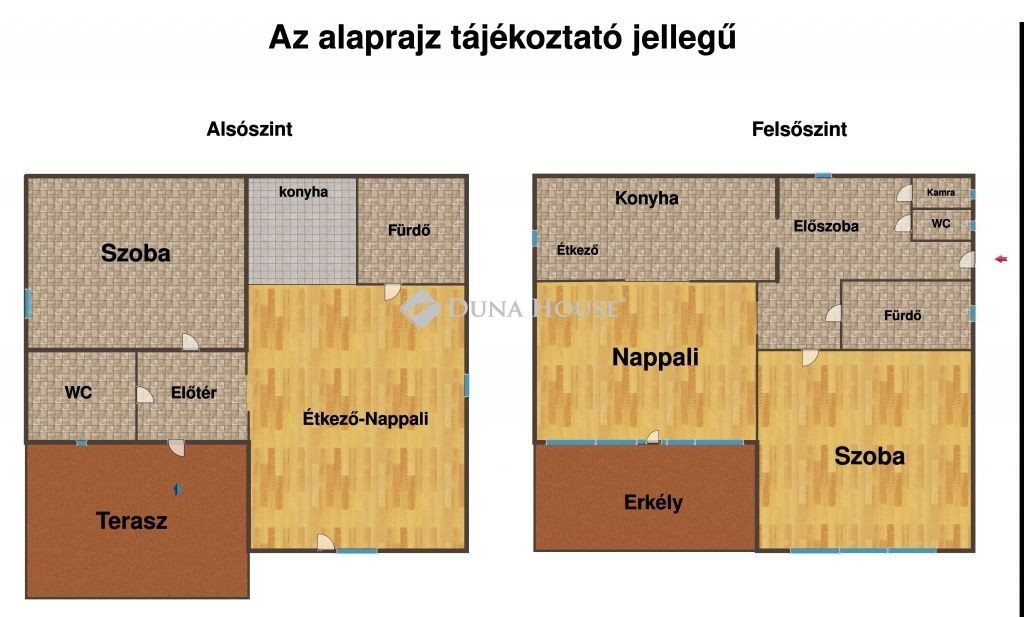 Az alsó szinten egy szoba, amerikai konyhás nappali, fürdőszoba, külön WC és terasz található.