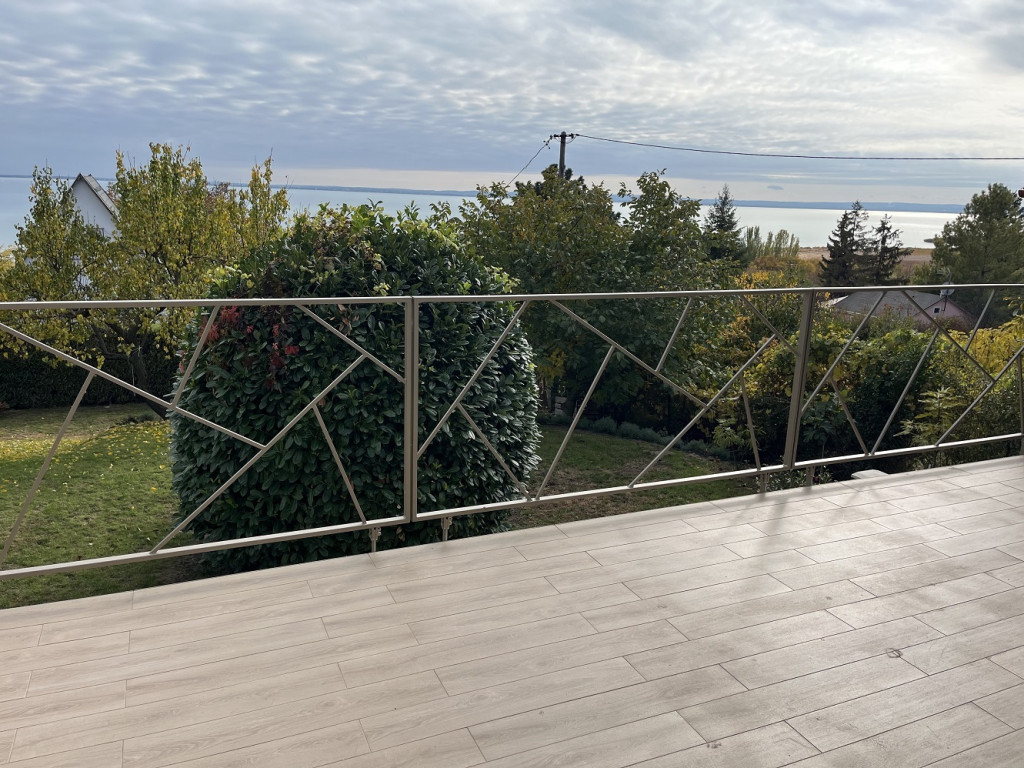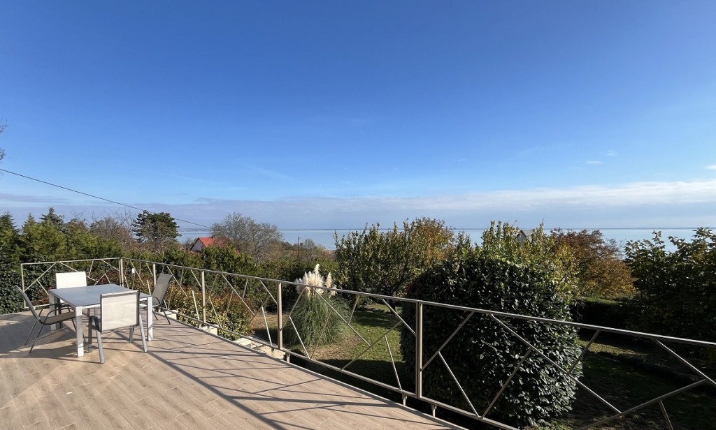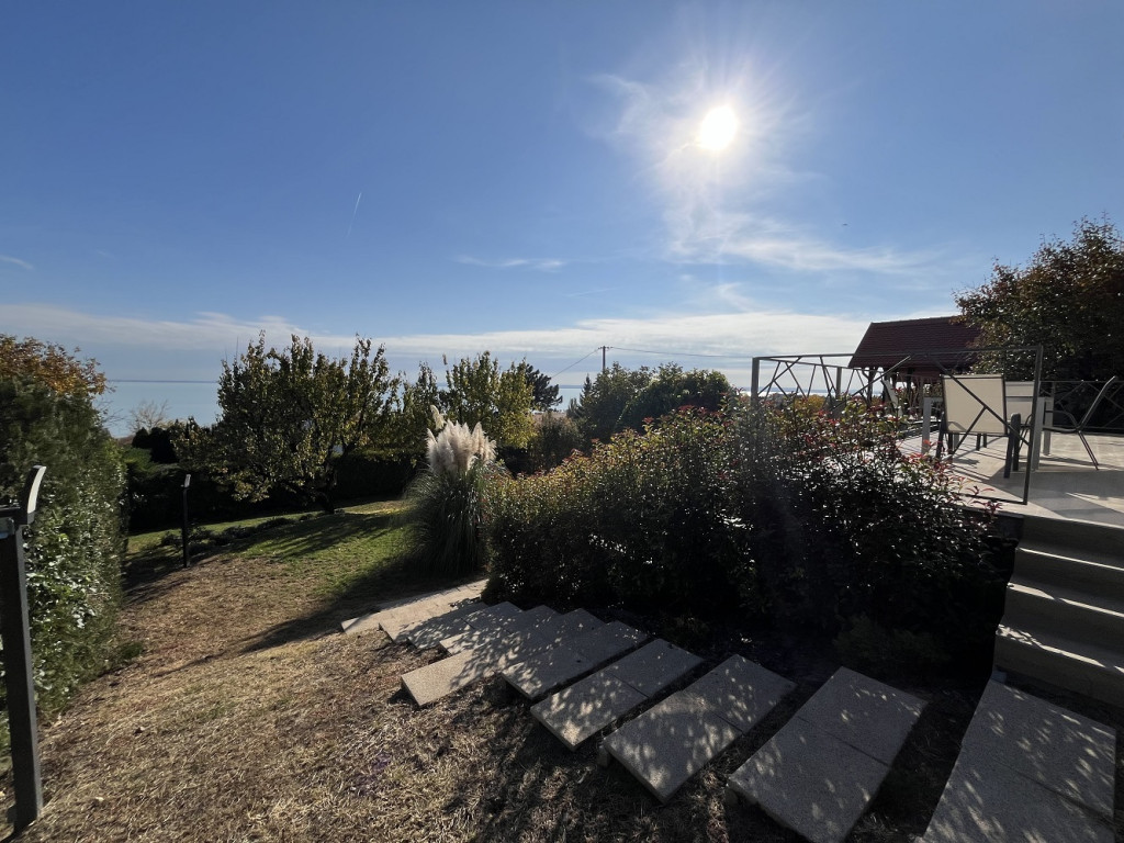 A telek mérete 870 m2-es. A szomszédos épületek nem lógnak bele a pazar kilátásba. A balatoni panoráma igazából a felső 2 szintről hibátlan, szinte 180 fokban tárul fel a Balaton, Tihanytól Balatonkeneséig. A kert szintjéről lombhullást követően élvezhető a panoráma.