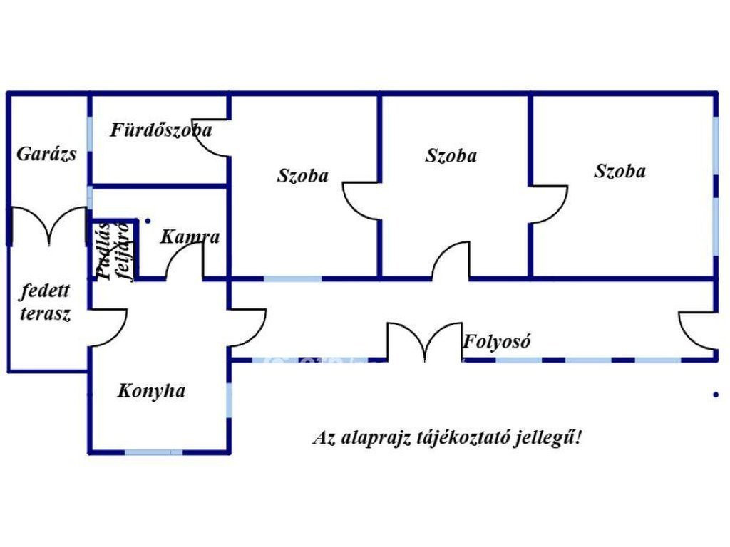 A házban 3 nagy szoba, konyha, közlekedő, kamra, fürdőszoba wc-vel, és padlásfeljáró helyiségek találhatóak.