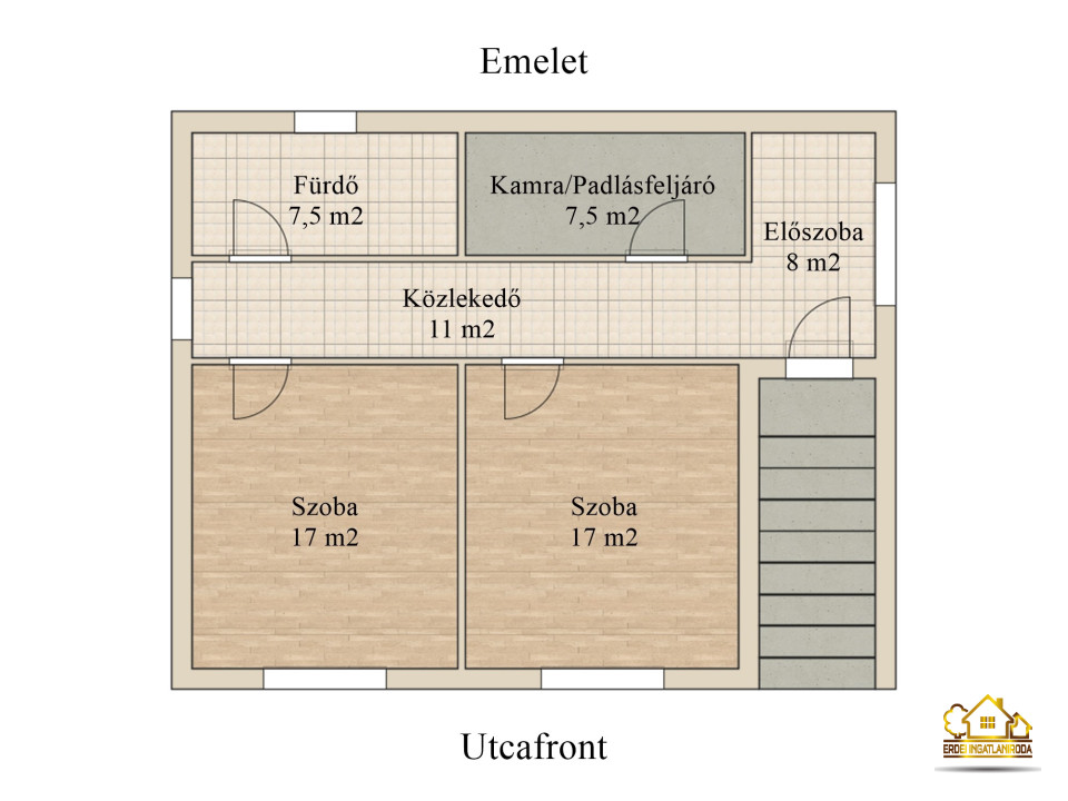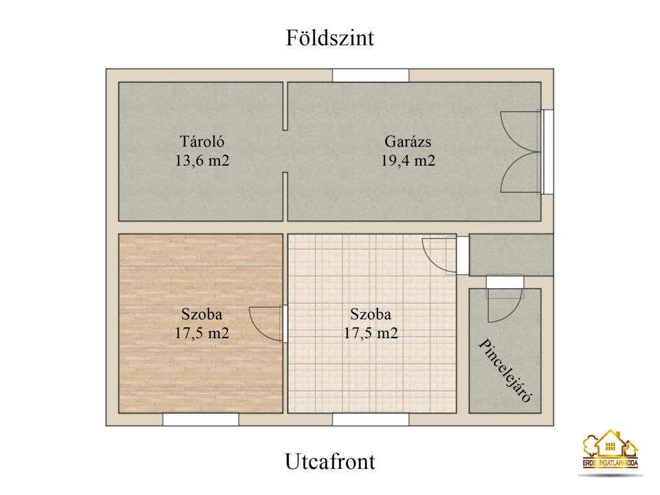 Az ingatlanban a földszinten található egy konyha és egy hálószoba, mellette külön bejárattal egy két részre osztott 23 m²-es garázs és tárolóhelyiség, ahol a vegyes tüzelésű kazán és a gázkazán áll. A felső szintre egy külső lépcsőn jutunk fel. Itt áll egy világos előszoba, 2 utcafrontra néző hálószoba, egy fürdőszoba és egy tárolóhelyiség, ahonnan a padlásra is fel lehet menni.