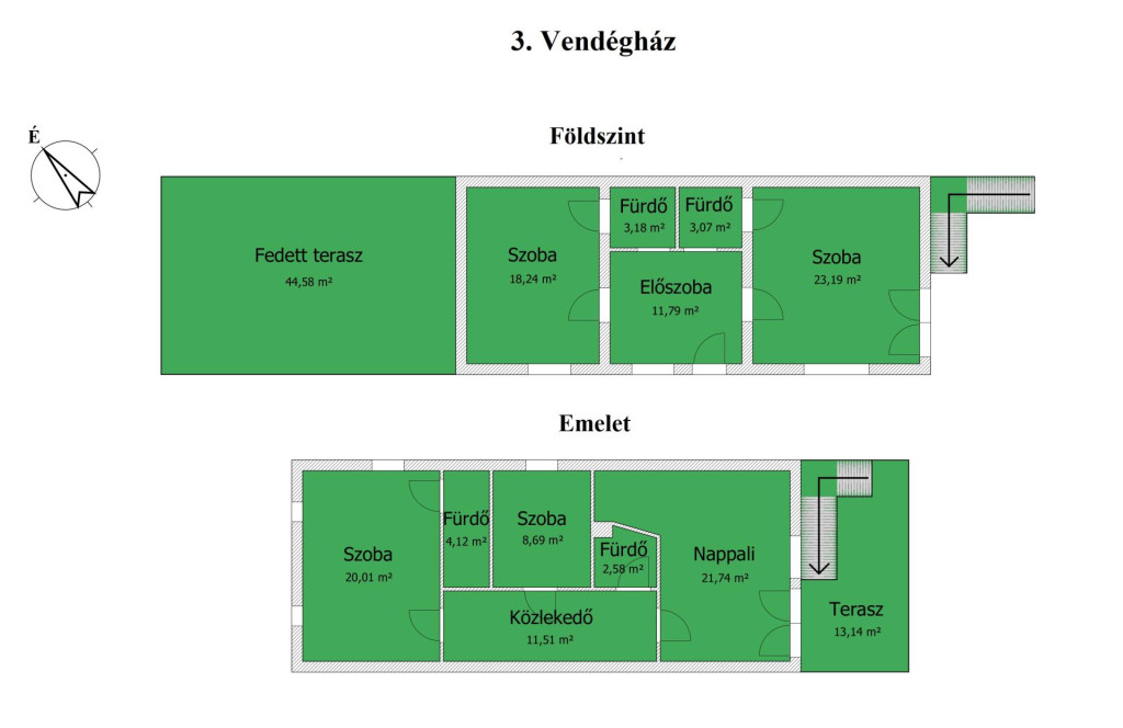 A három különálló vendégház között egy üres telekrész is található, ami nemcsak kényelmes elrendezést biztosít, hanem további fejlesztési és bővítési lehetőséget is kínál a jövőbeni tulajdonos számára.