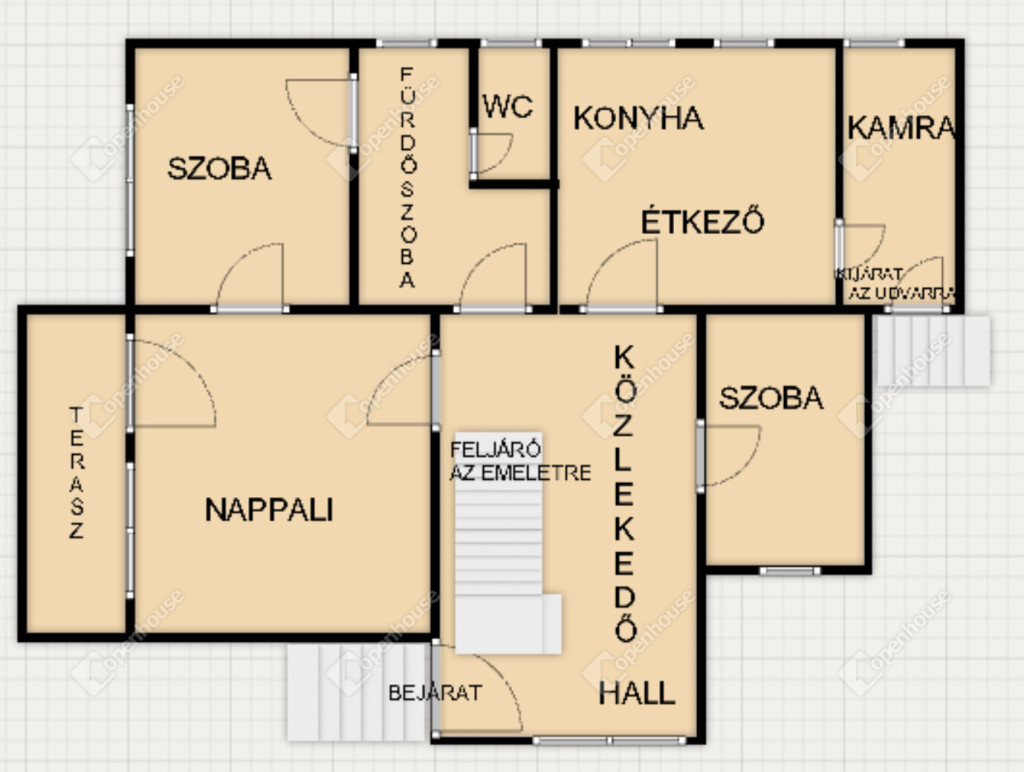 - előszoba, közlekedő, konyha-étkező, kamra, fürdőszoba, wc külön, nappali, két kényelmes méretű szoba