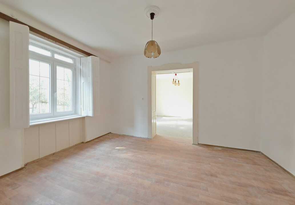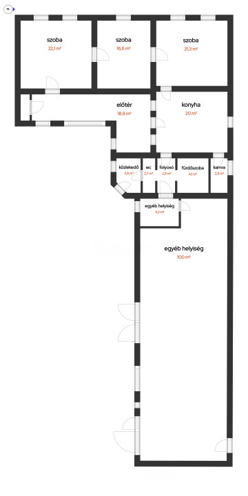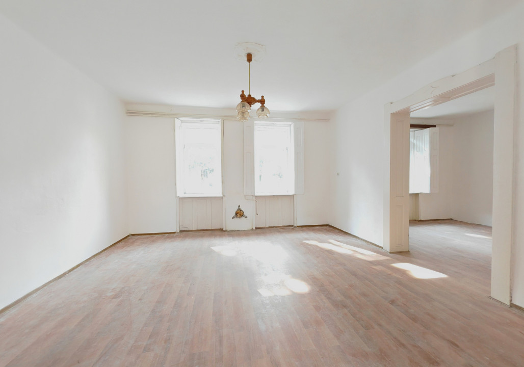 A 120 m2-es lakótér 3 benapozott szobával és nagy alapterületű konyhával rendelkezik, utóbbi kialakítása a vevőre vár.