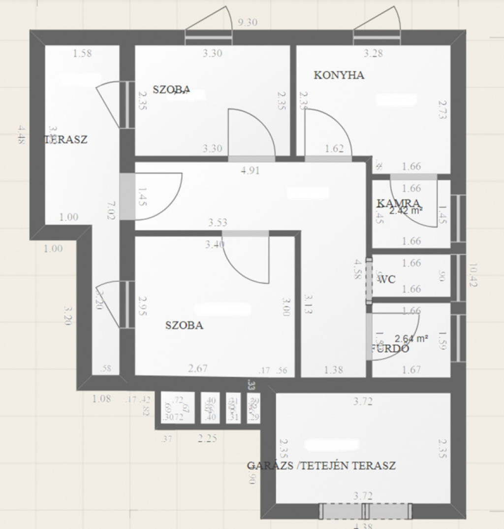 2 nagy szoba, nagy ablakos, világos konyha, kamra, fürdőszoba, külön mellékhelyiség, terasz (8 m2).