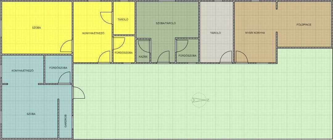 Ezek folytatásaként egy udvari tároló helyiség (10,5 m2) és egy fedett tornác található, majd egy 2 helyiségből álló rész következik, ez raktározás, nyári konyha céljára hasznosítható. Innen juthatunk le a 13 m2 alapterületű, boltíves földpincébe.