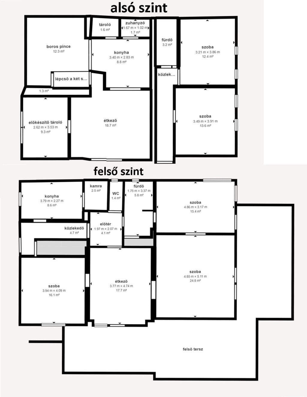 A felső szintre, mely a telek lejtéséből adódóan LÉPCSŐ NÉLKÜL JUTHATUNK BE. Egy kis előtérbe érkezünk, ahonnan szemben az alsó szintre vezető lépcső van, balra pedig egy közlekedő, melyből nyílik a TÁGAS KONYHA, melyet egy méretes kamra egészít ki. A közlekedőn tovább haladva egy kis előtérbe érkezünk. Innen balra egy külön WC, jobbra az étkező, szemben pedig a fürdőszoba található. A fürdőből nyílik egy kis tároló, mely a takarító berendezések tárolására kiváló. A fürdőből tovább haladva a VILÁGOS, KÉNYELMES MÉRETŰ HÁLÓSZOBÁBA érkezünk. A hálóból közvetlenül léphetünk ki a TÉNYLEG NAGY ERKÉLYRE, ahonnan kinézve GYÖNYÖRŰ BALATONI PANORÁMÁBAN gyönyörködhetünk.