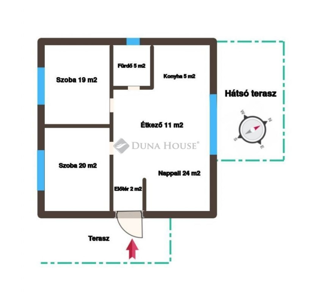 A nappaliból hangulatos hátsó teraszra lehet kimenni, ahonnan az udvarra látunk.