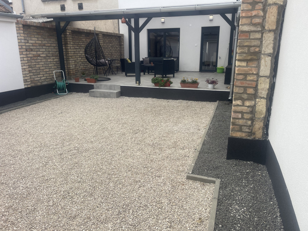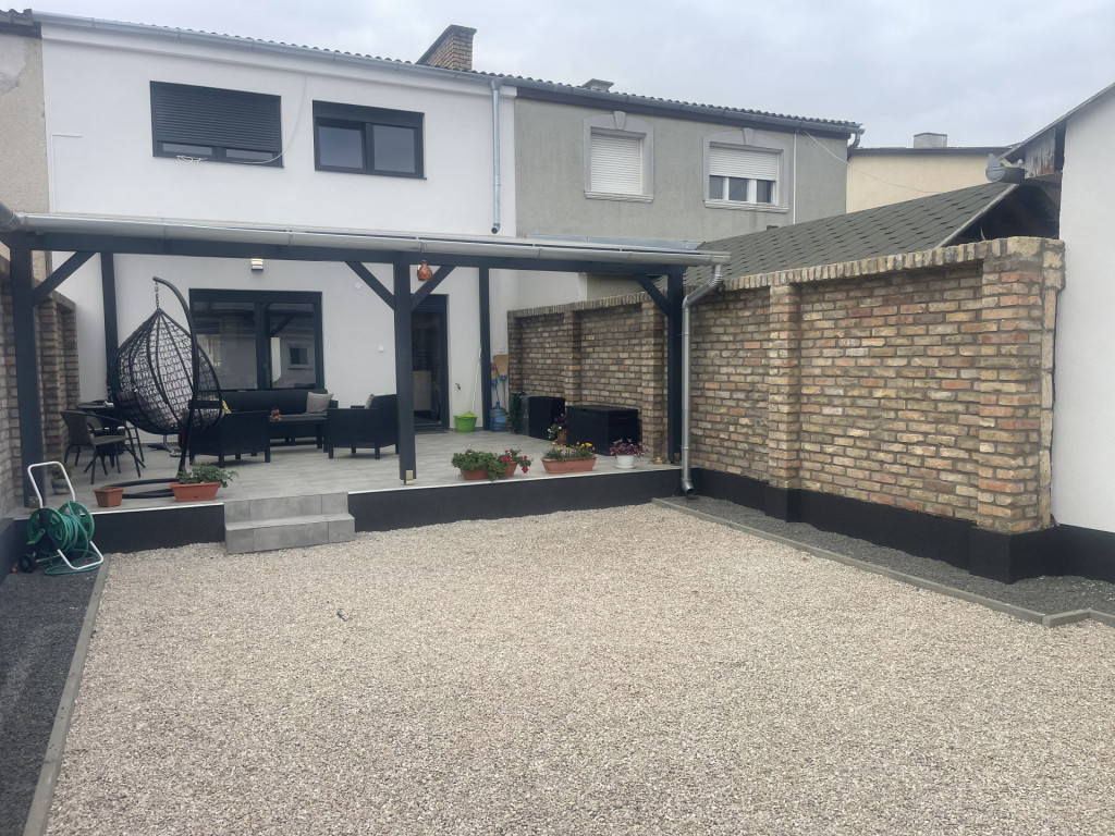 Az udvaron fedett saját privát terasz(30m2-es), plusz egy 40m2-es melléképület az udvar végében.